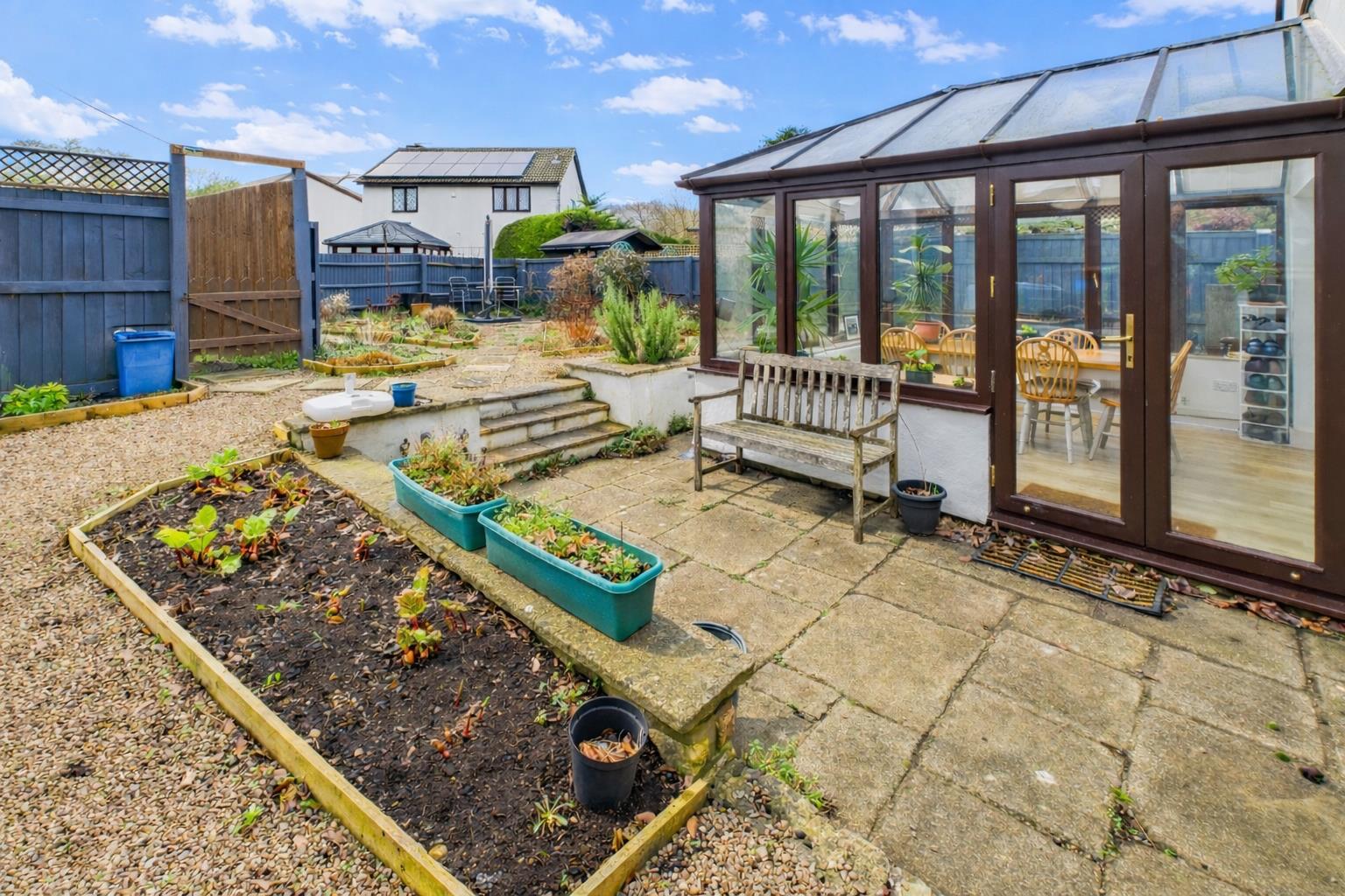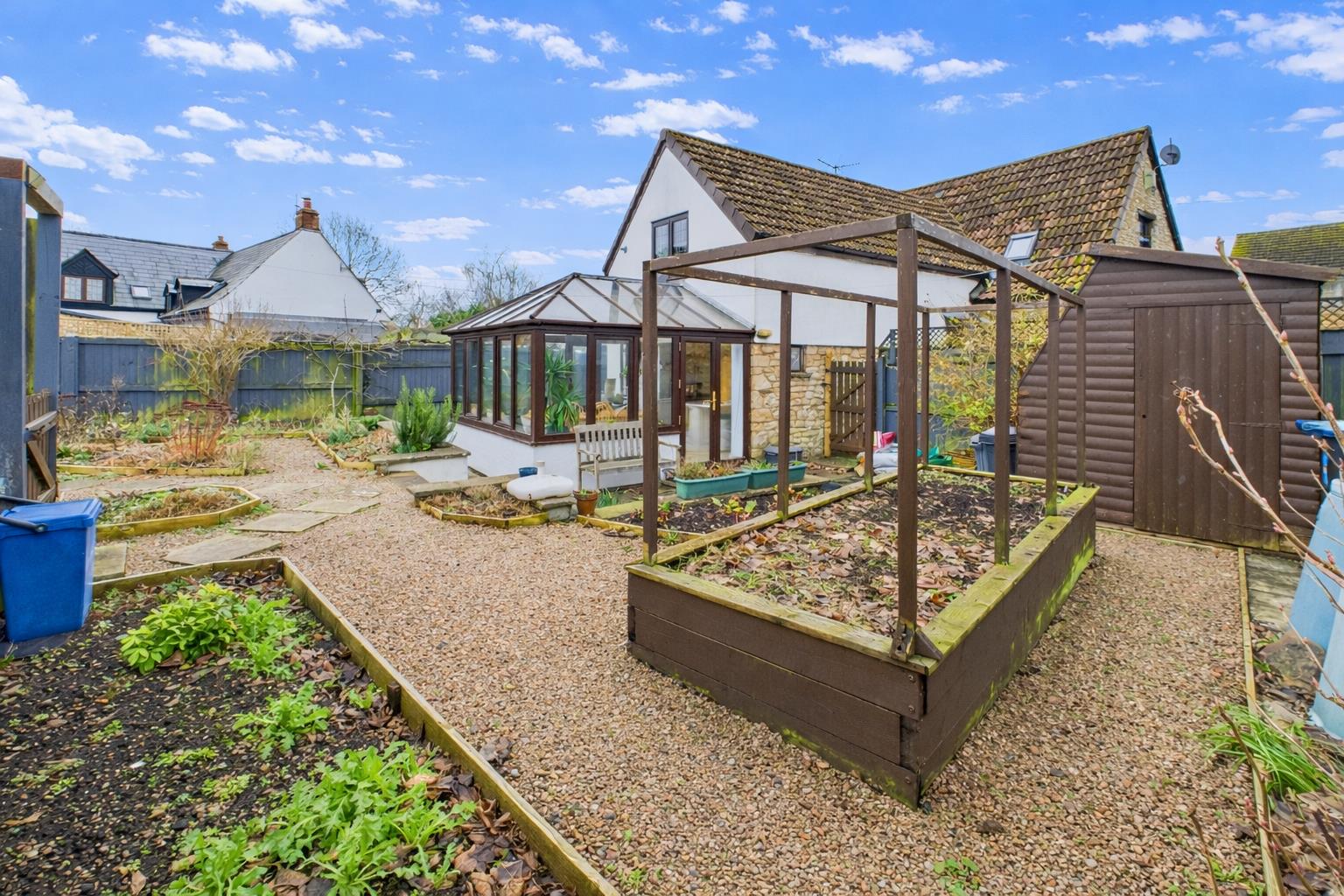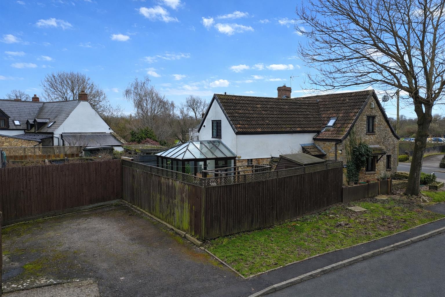 The property stands in cottage style corner gardens with pedestrian access to the front. The rear and side gardens with a variety of mature flower and shrub borders. There is also a pedestrian gate leading to private car parking space.