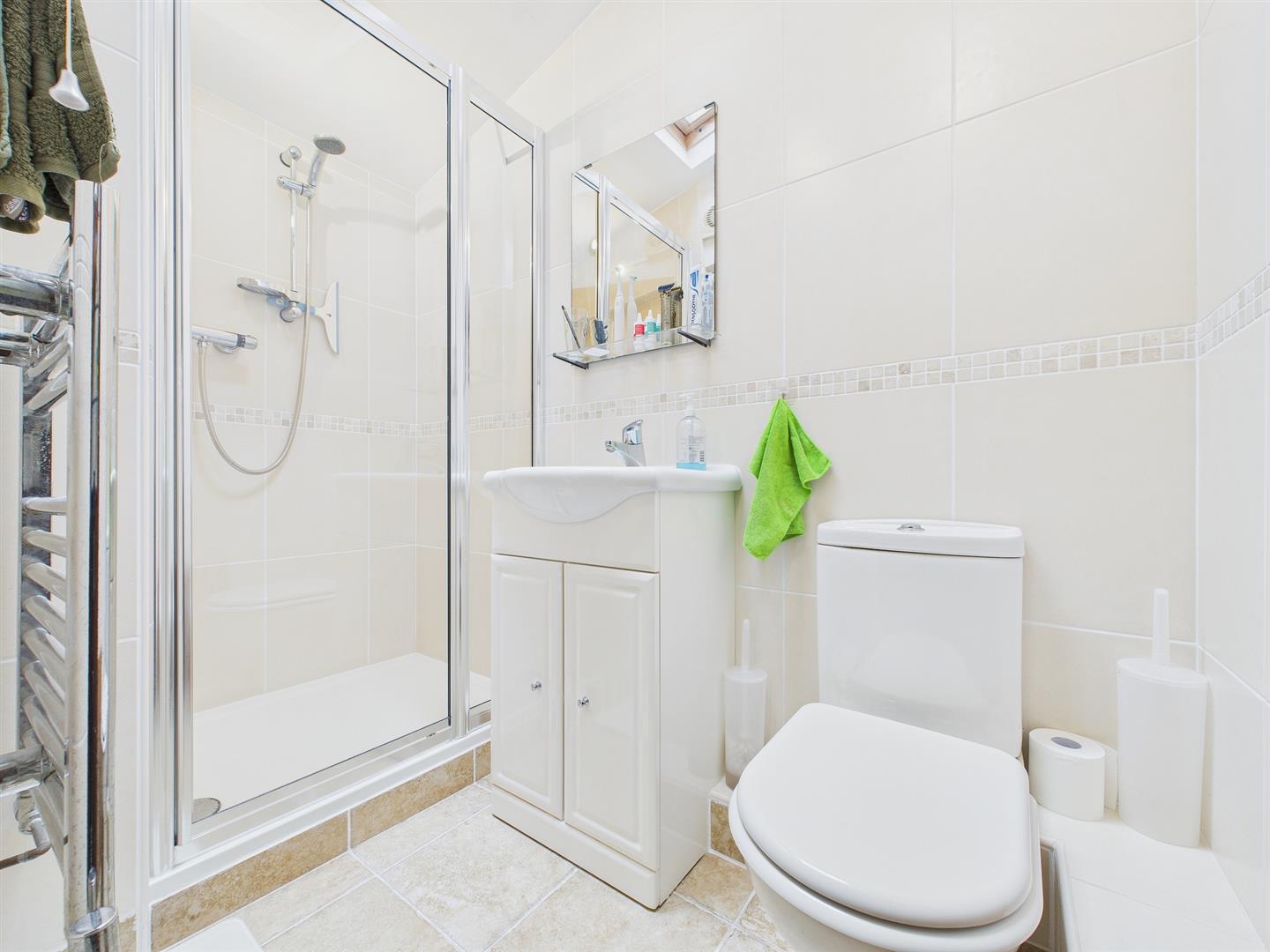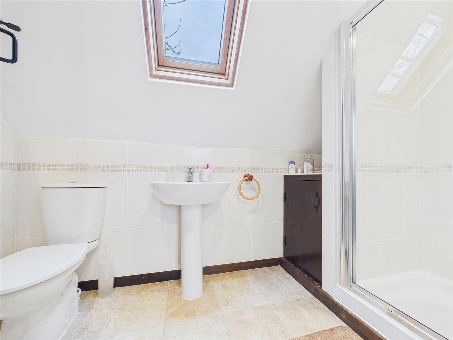 Comprising step-in shower, low-level WC and pedestal wash hand basin. Storage cupboard. Tiled walls and flooring. Velux rooflight.