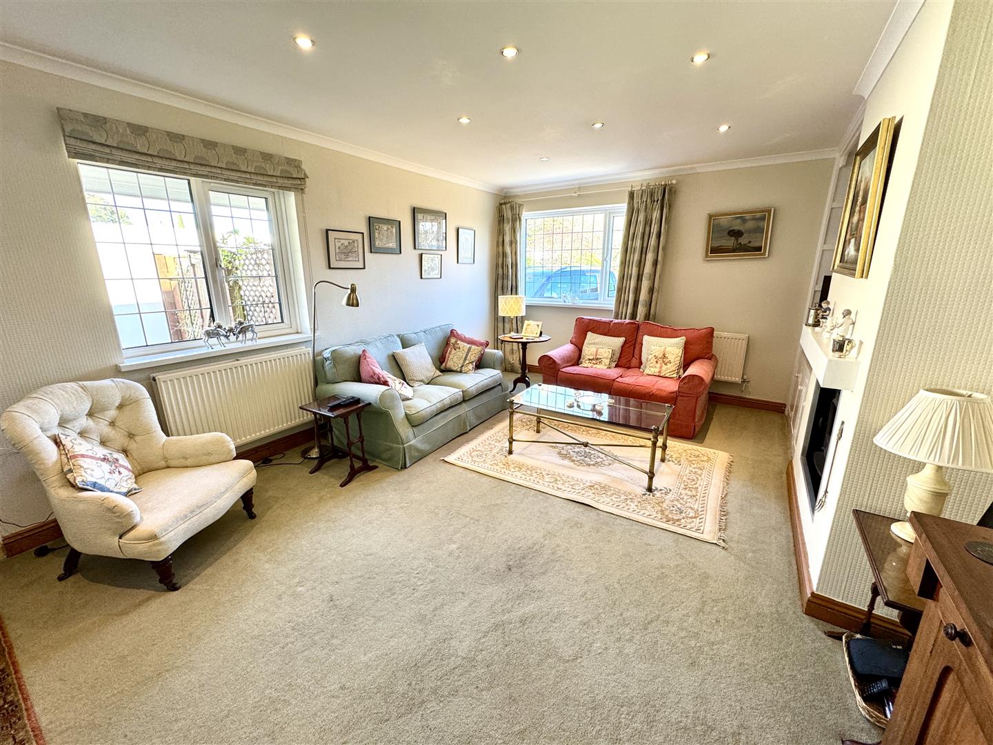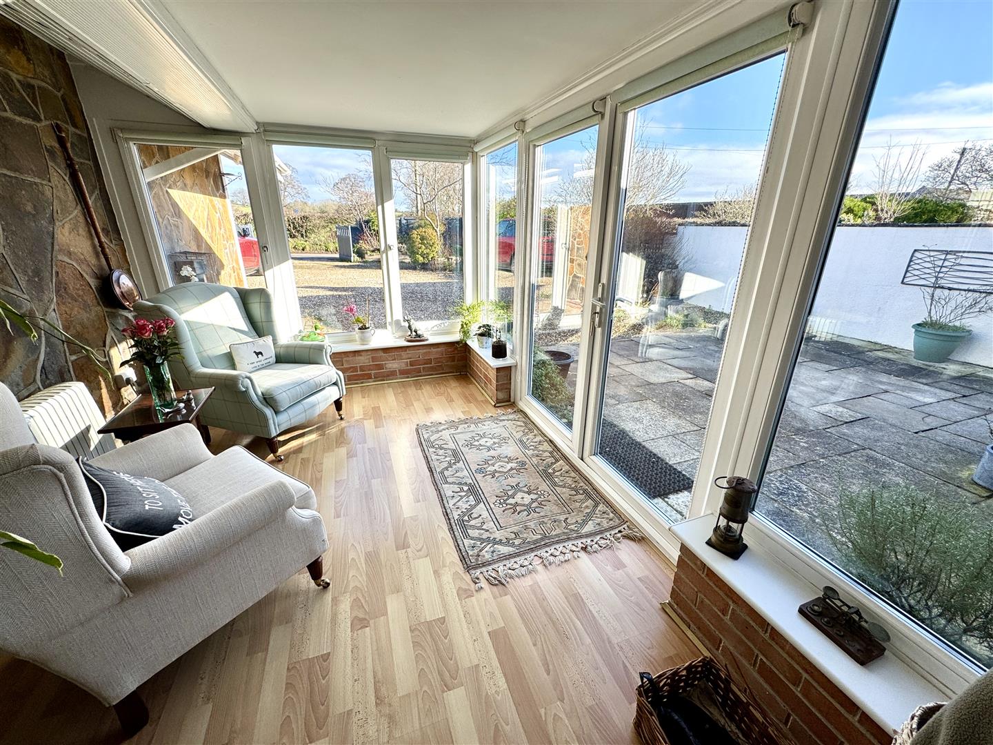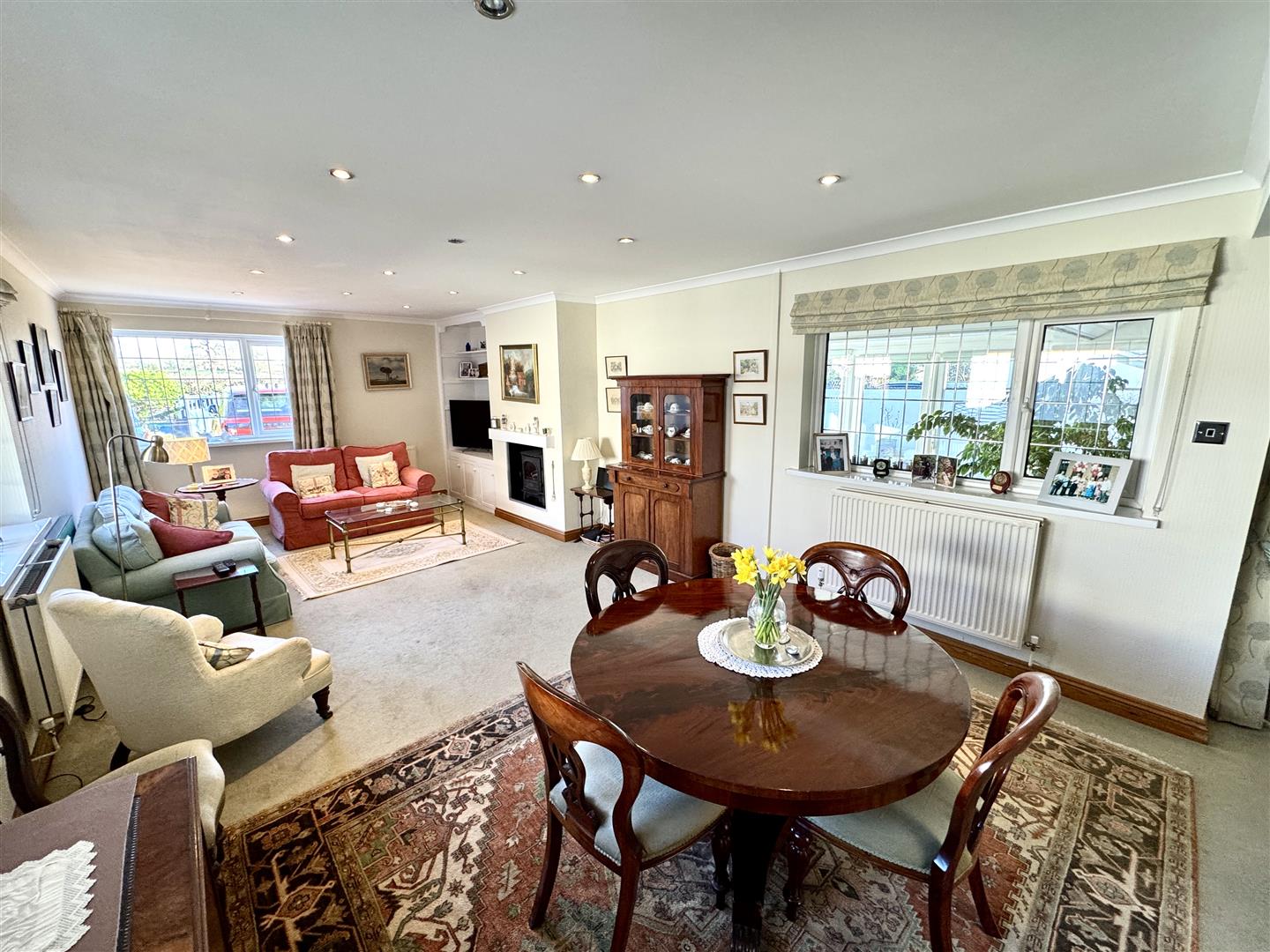 With triple aspect windows ensuring plenty of natural light. Feature fireplace with gas woodburning style stove.