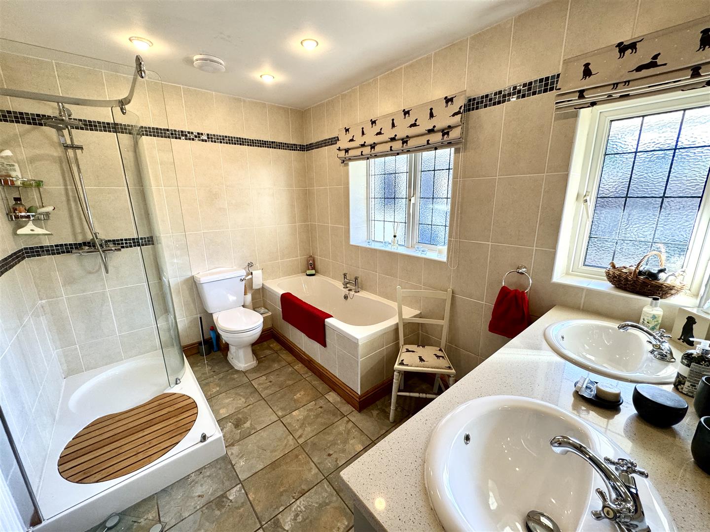 Appointed with a four-piece suite to include low-level WC, panelled bath with mixer tap, twin vanity basins with mixer taps and a step-in shower with with waterfall shower over and a separate hand-held shower attachment. Fully tiled walls and flooring. Two frosted windows to rear.