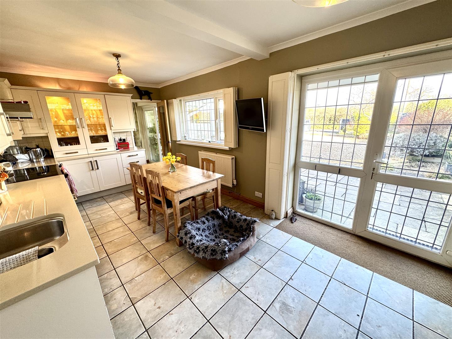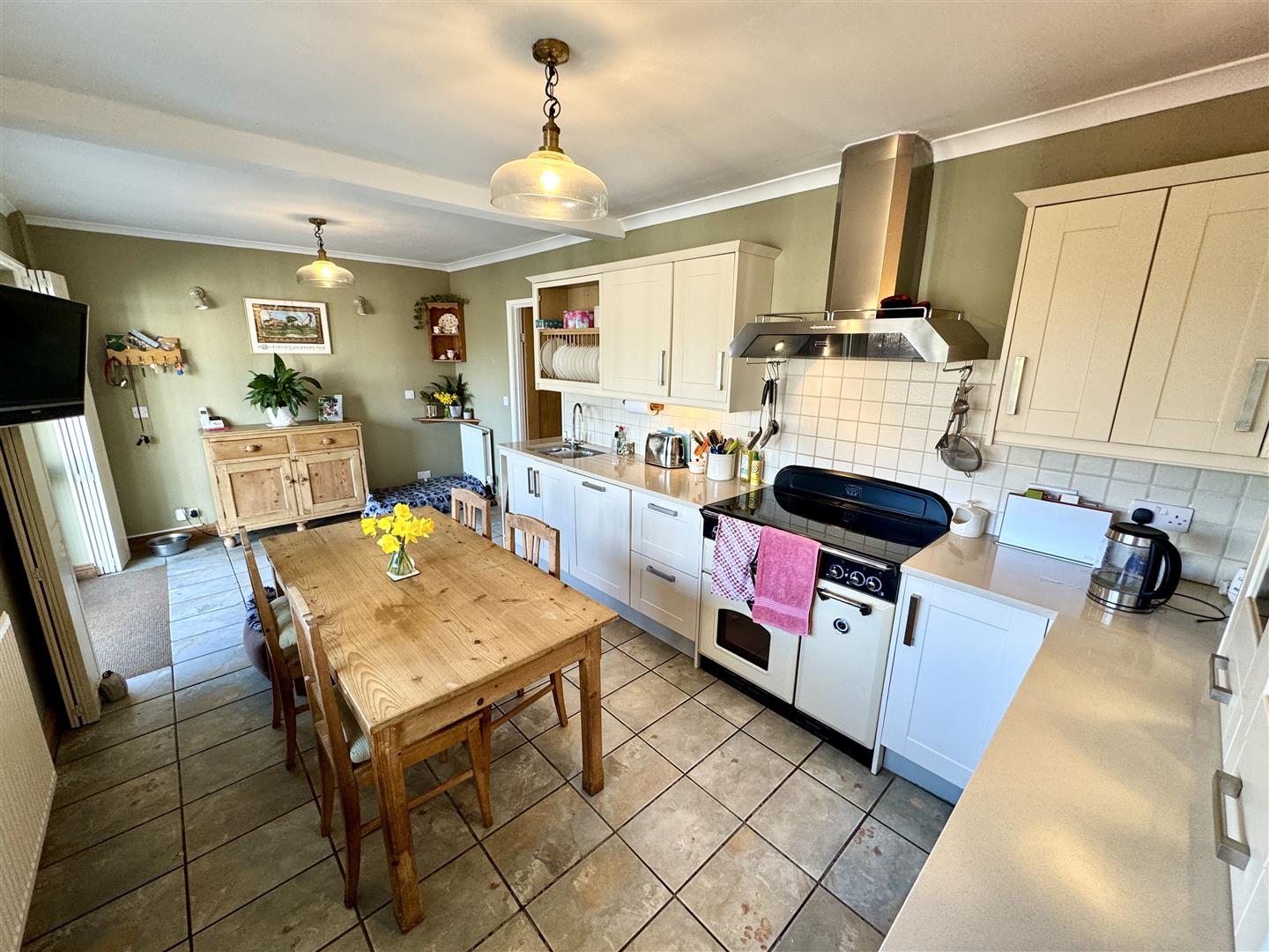 Tastefully updated with a contemporary range of base and eye level storage units with ample quartz work surfacing over and tiled splashbacks along with glass fronted china display cabinets. One and a half stainless steel bowl sink with mixer tap. Electric range with induction hob and extractor hood over. Integrated dishwasher. Window and French doors to front garden with shutters. Tiled flooring.