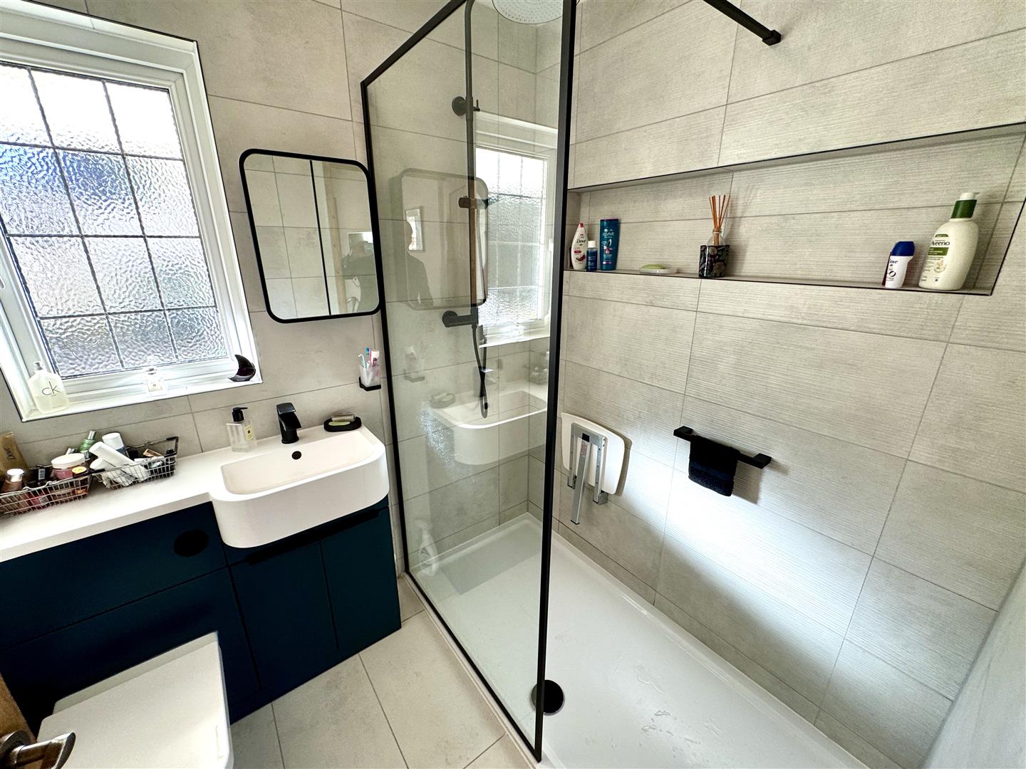 Attractively updated shower room with contemporary fitments with tiled finishes to floor and walls. Step-in shower with waterfall shower over and a separate hand-held shower attachment, low-level WC and vanity wash hand basin with mixer tap. Frosted window to rear.