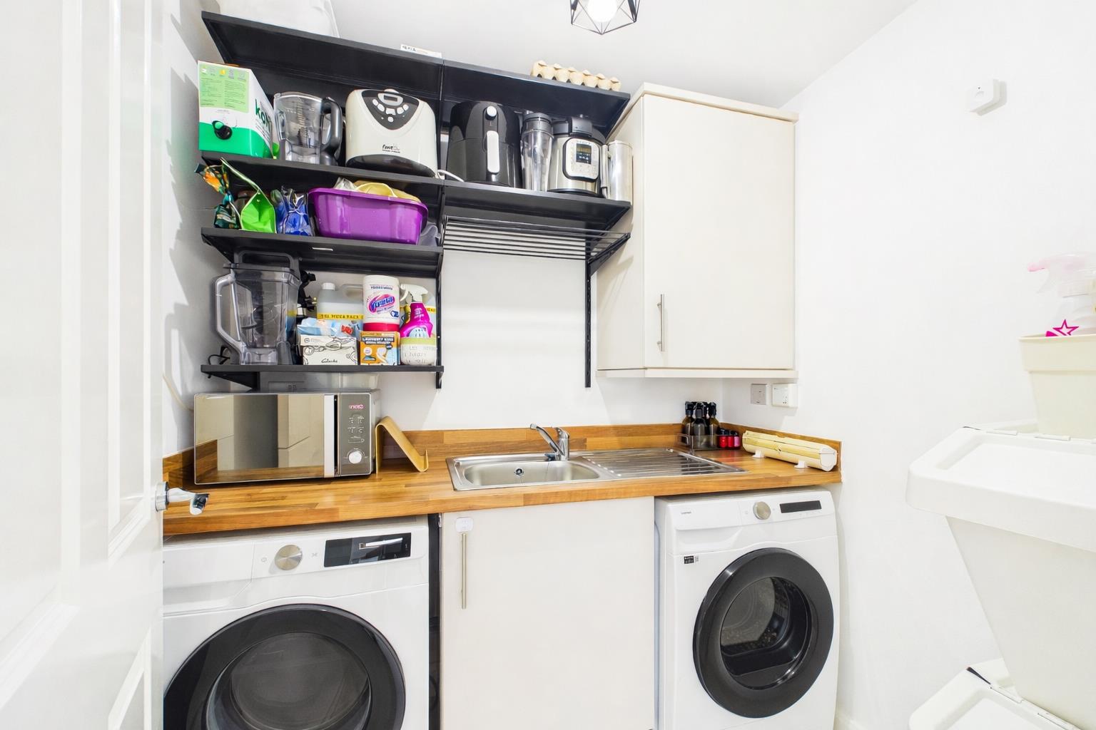 Wooden effect work surfacing with inset stainless steel single bowl sink and drainer with chrome mixer tap. Space for under counter washing machine and tumble dryer.