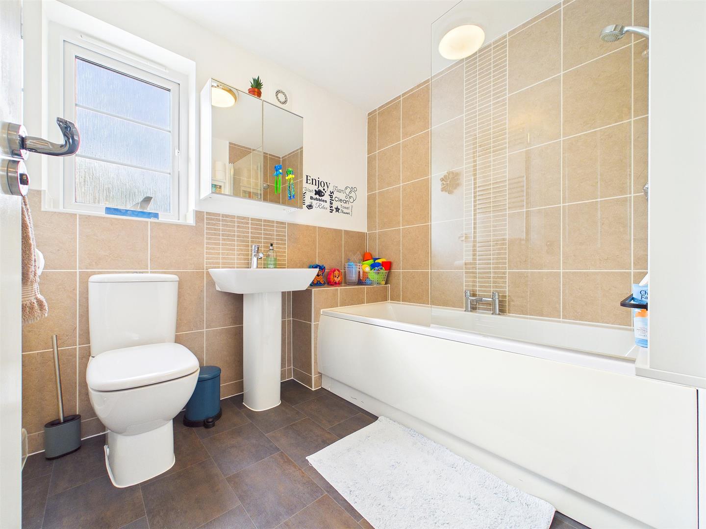 Comprising a three-piece suite to include a low-level WC, pedestal wash hand basin with chrome tap and a double ended panelled bath with chrome mixer tap, chrome shower attachment and glass shower screen. Chrome heated towel rail. Half-tiled walls and tiled floor. Frosted window to rear elevation.