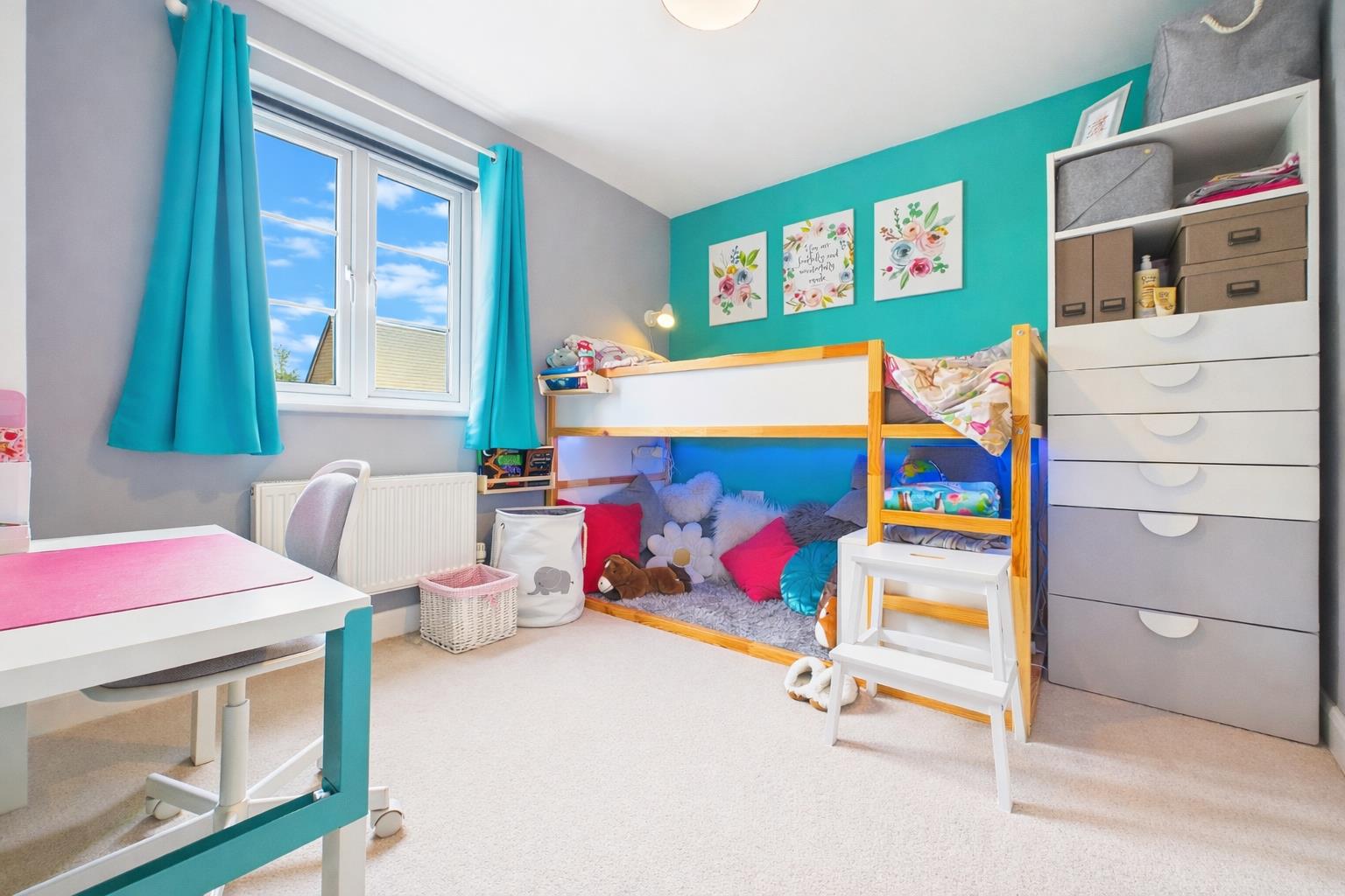 A double bedroom with window to rear elevation and built-in wardrobes.