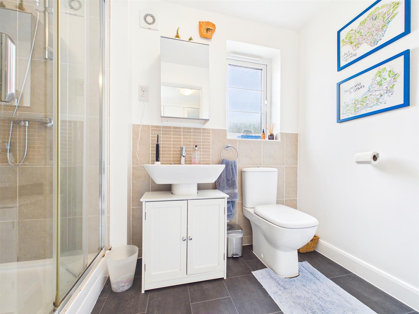 Comprising of a three-piece suite to include a double shower unit with tiled walls and chrome shower attachment, low-level WC and wash hand basin with chrome mixer tap, vanity unit and tiled splashbacks. Chrome heated towel rail. Frosted window to side elevation.