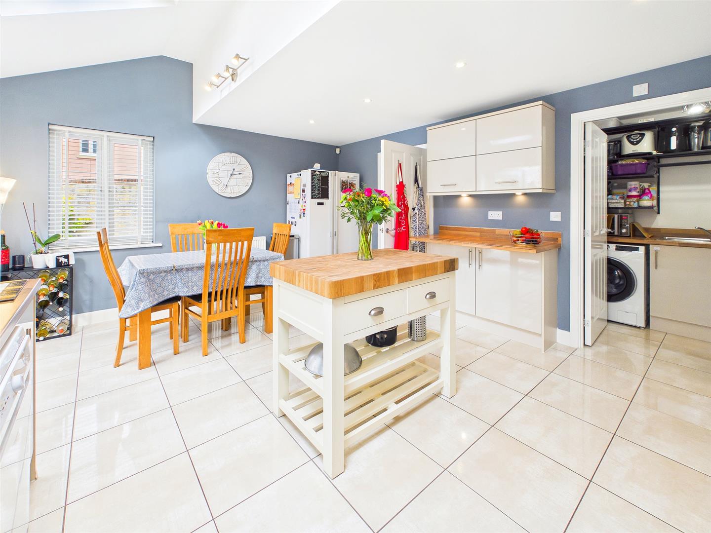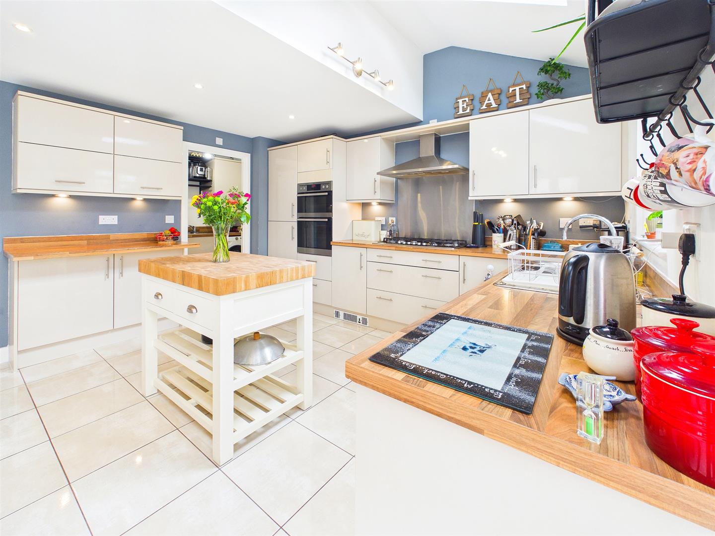 A lovely light and spacious part of the home with French doors to the private rear garden, windows to rear and side elevations and two roof lights. Fitted with a good range of eye and base level storage cupboards with wooden effect worktops and inset one and a half bowl stainless steel sink and drainer with chrome mixer tap. Integrated six ring gas hob with stainless steel extractor fan over and a built-in eye level double oven. Space for fridge, space and plumbing for dishwasher. Ceramic tiled floor. Door to:-