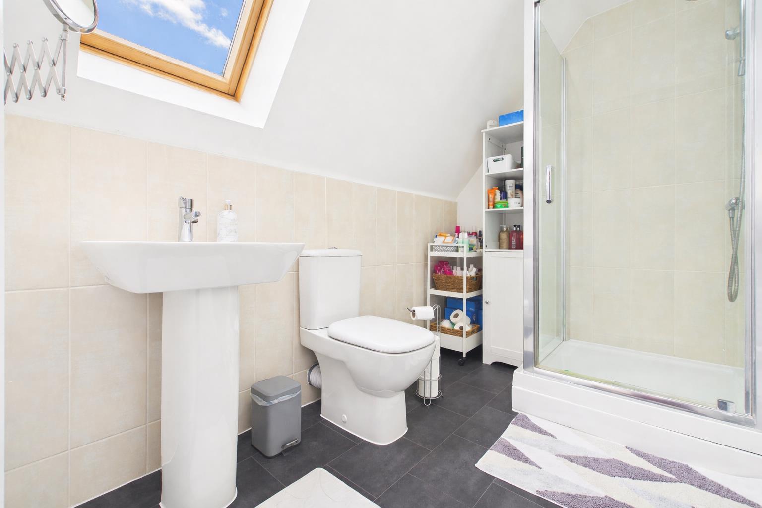 Comprising a three-piece suite to include pedestal wash hand basin, low-level WC, corner glass shower unit with chrome shower attachment. Chrome heated towel rail. Half-tiled walls and tiled floor. Roof light to rear elevation.