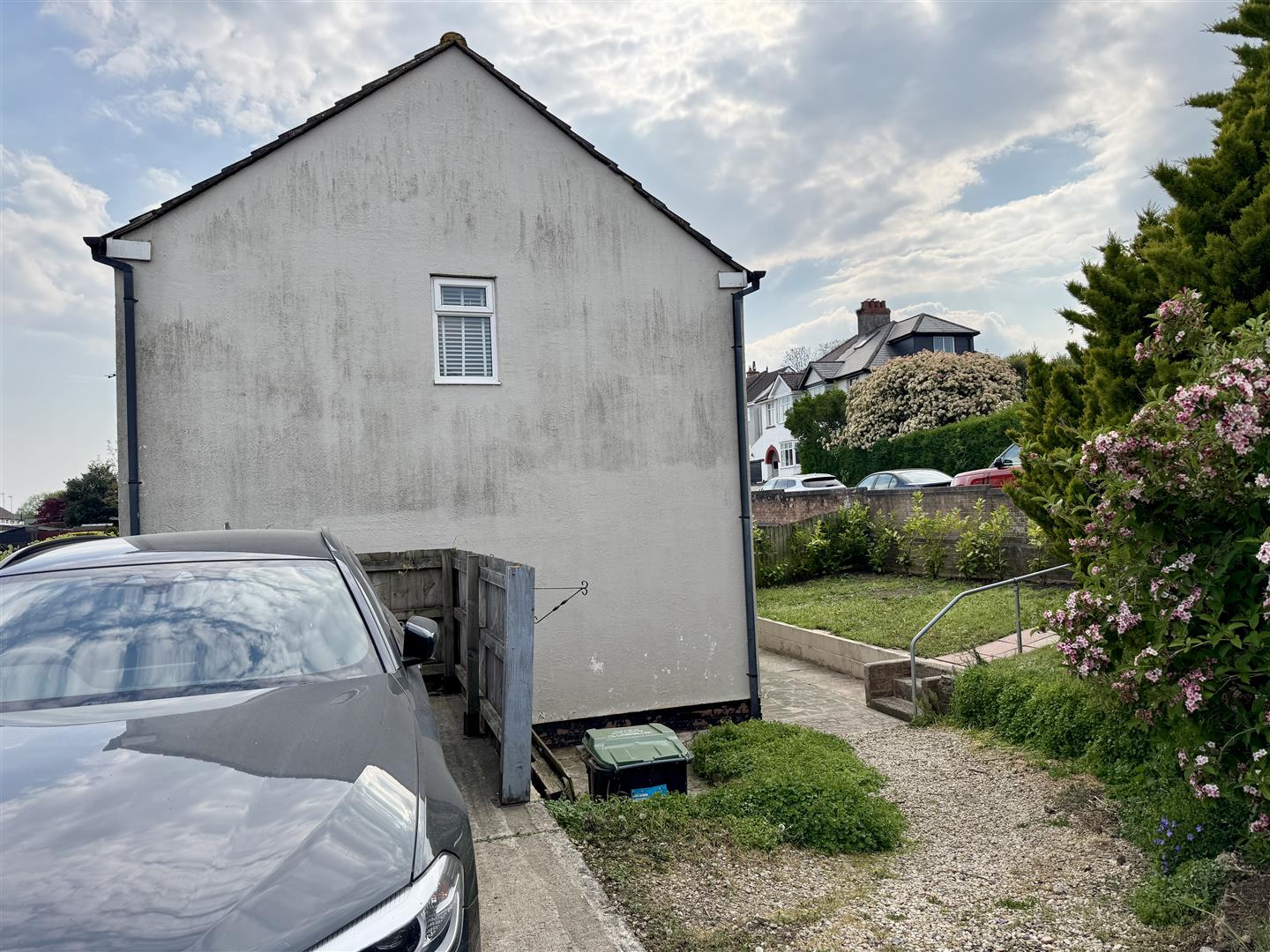 The property is approached via steps, the front garden benefits from a lawned area and being a corner plot it also offers an opportunity to extend. There is a private driveway providing off-road parking for one vehicle.