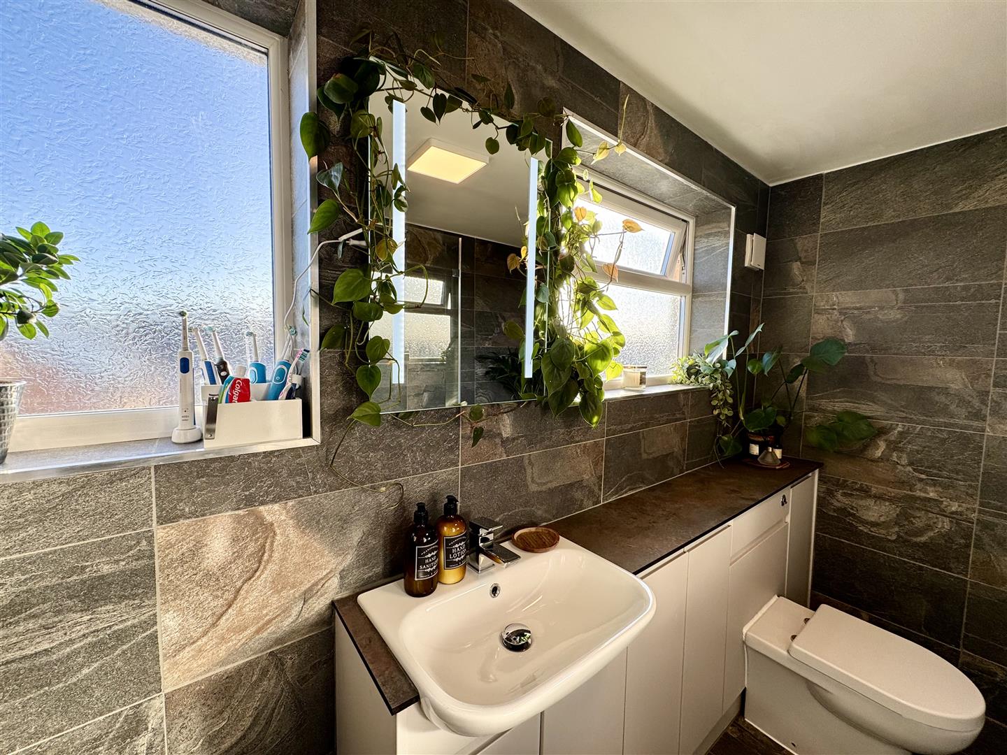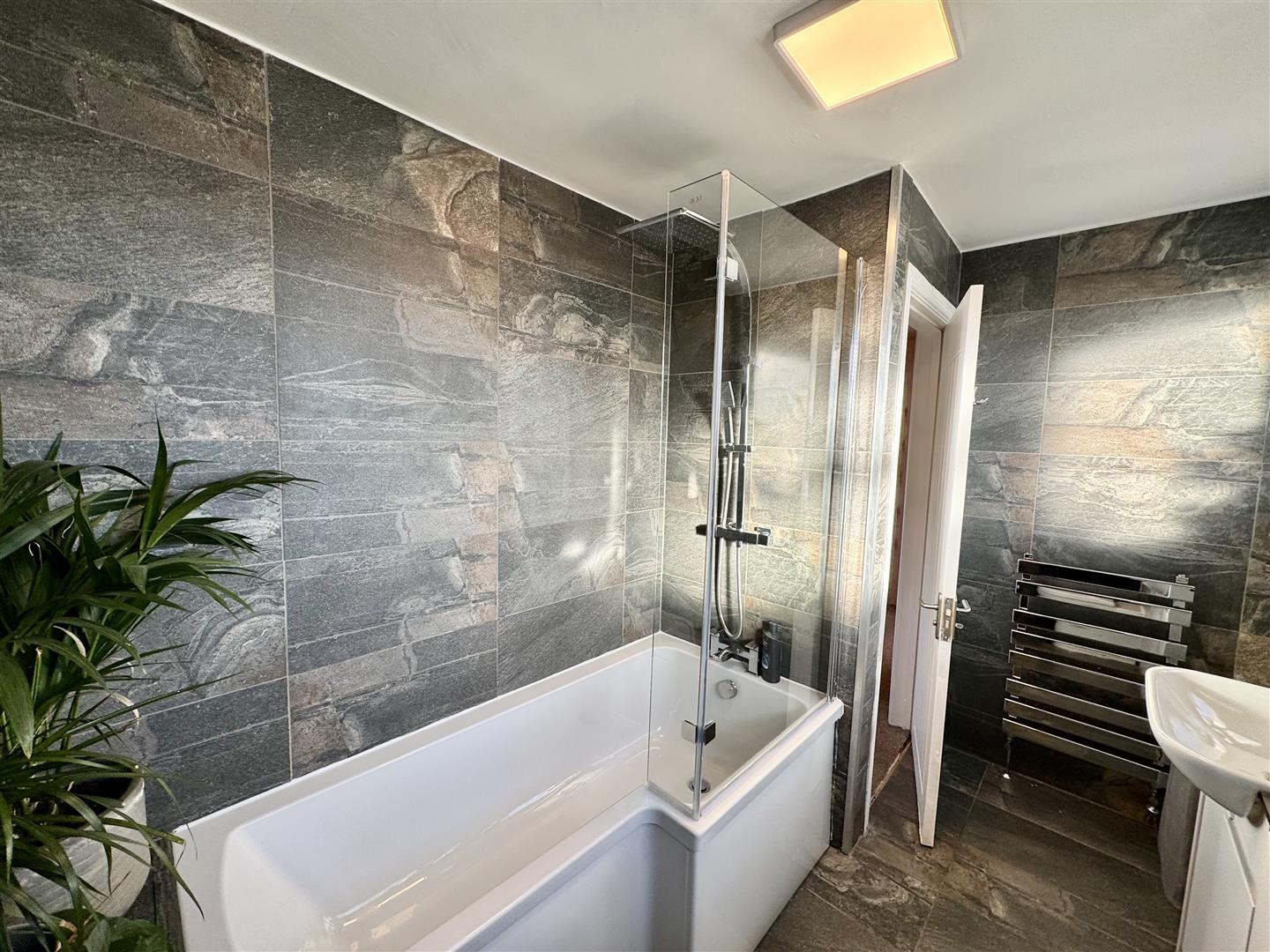 Recently updated and comprises a three-piece suite to include panelled bath with glass shower screen and rainfall shower over as well as hand-held shower attachment, low level WC and wash hand basin inset into storage unit. Heated towel rail. Two frosted windows to rear elevation. Tiled walls and tiled flooring.