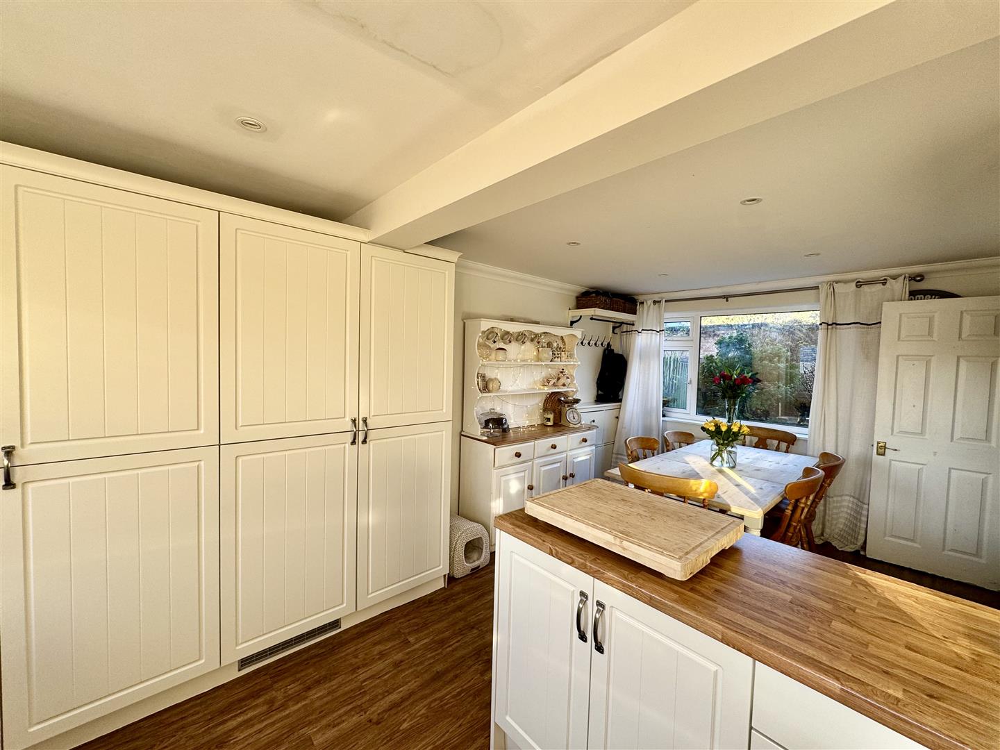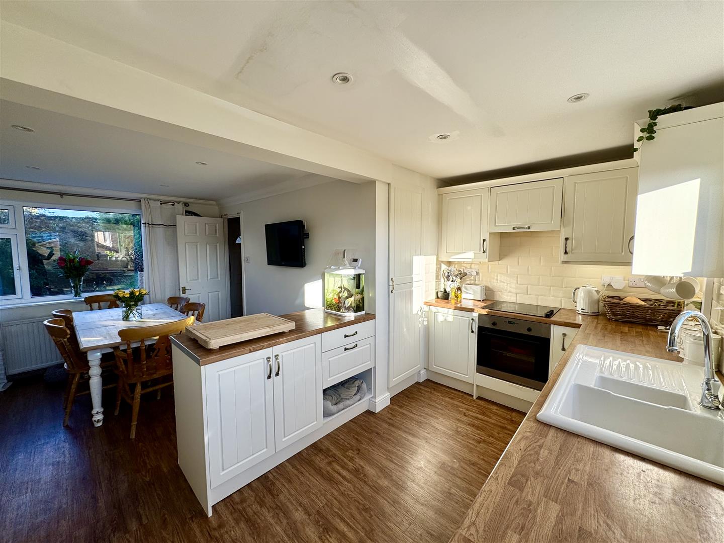 Bright and airy open plan kitchen/dining room perfect for family living as well as entertaining. Wood effect flooring.
