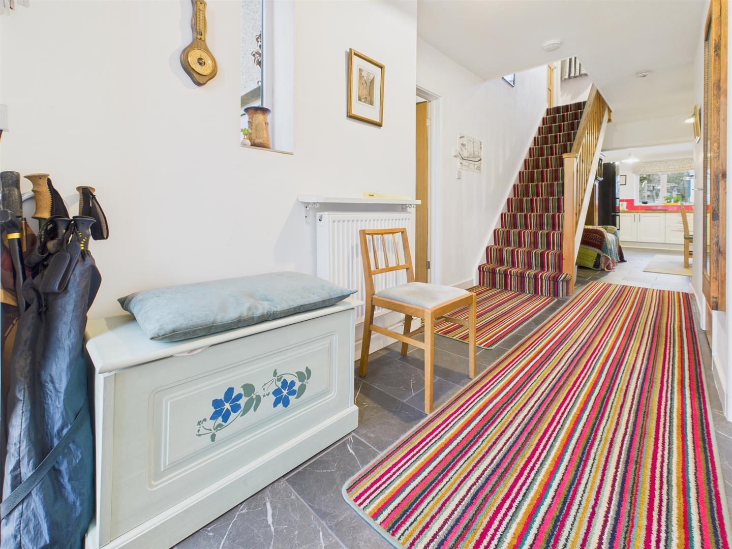 Door and glazed panel to front elevation with tiled floor, and stairs to first floor. Built-in storage cupboard.