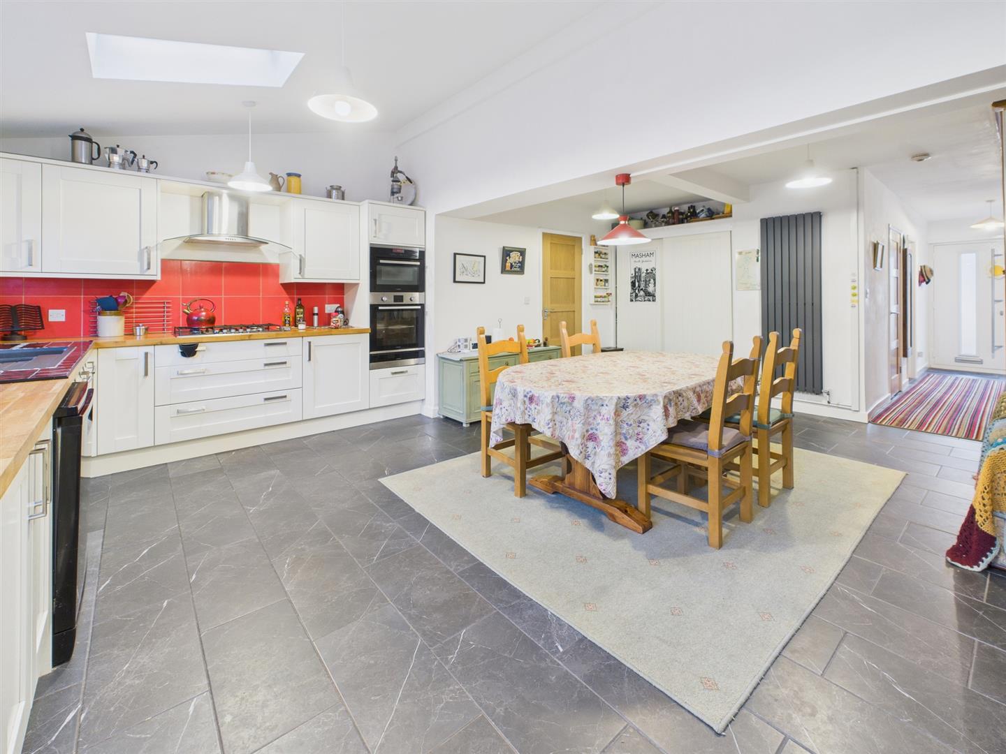 An impressive family kitchen with an excellent range of fitted base and eye level storage units with wooden worktops and tiled splashbacks. Inset one and a half bowl sink and drainer with mixer tap. Integrated five ring gas hob with feature extractor hood and bult-in eye level ovens. Integrated dishwasher. Two windows to the rear elevation and twin Velux roof lights. Tiled flooring. Built-in store cupboard. Door to:-
