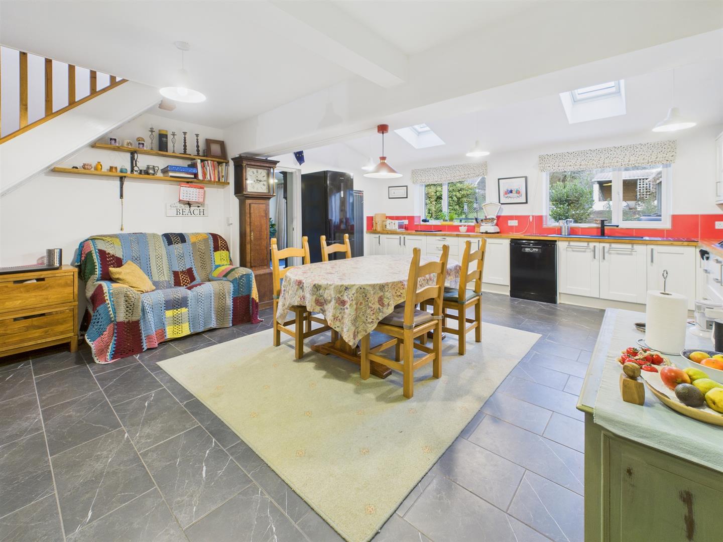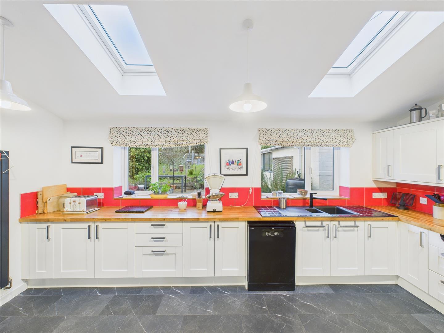 With tiled flooring. Two Velux rooflights and French doors leading out to the rear garden.