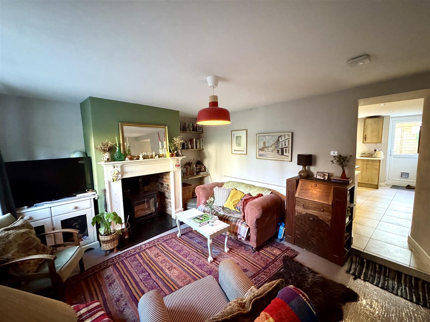 Window and door to front elevation. Feature fireplace with recently installed wood burning stove. Shelving to recess.