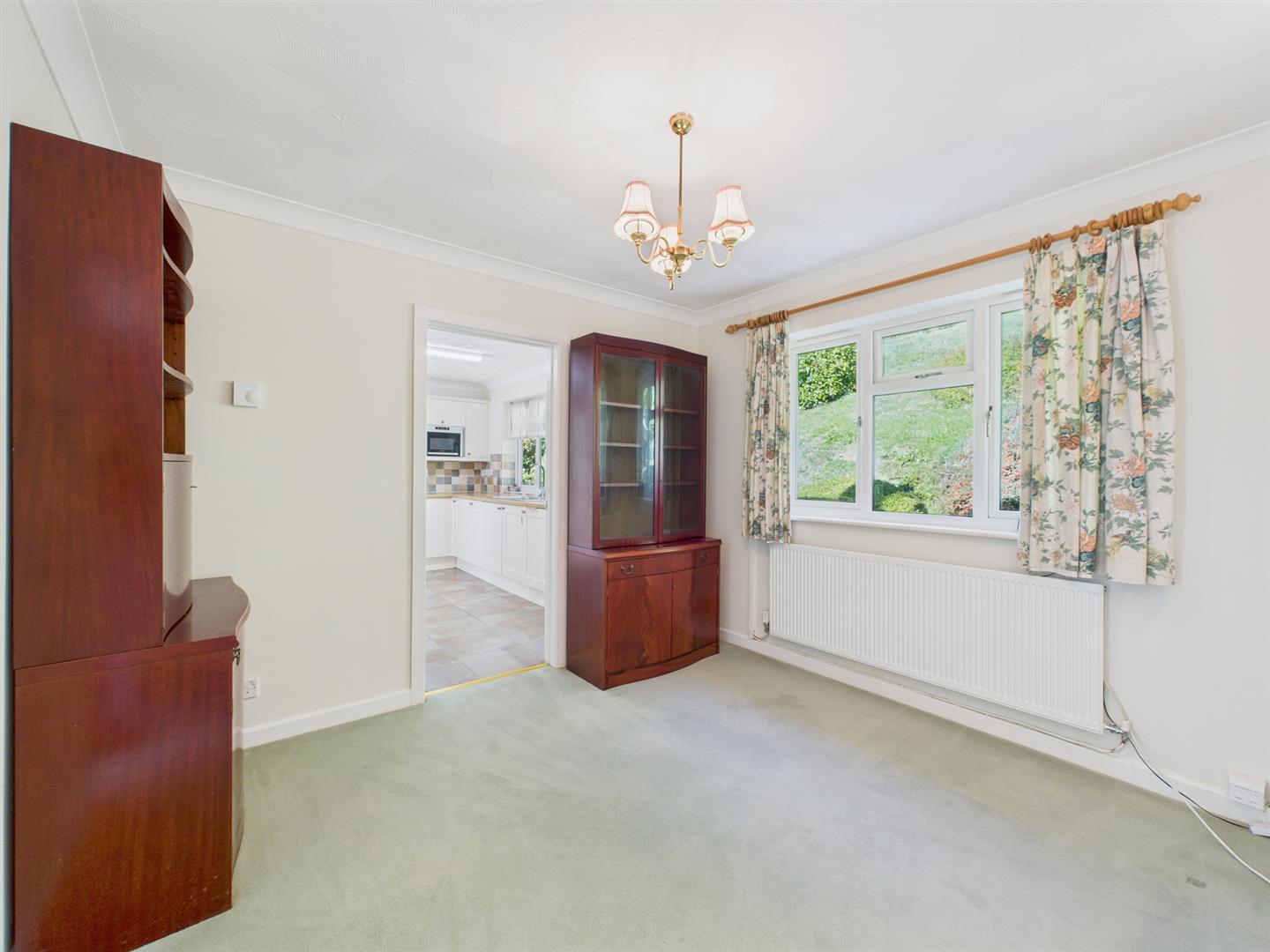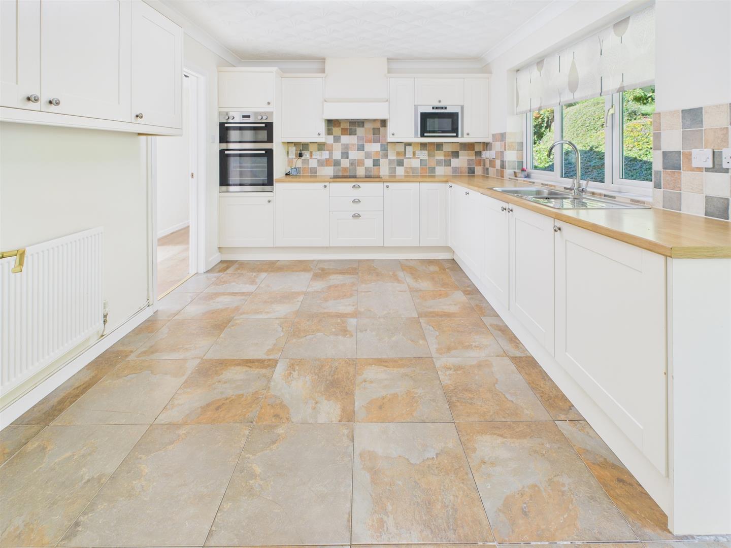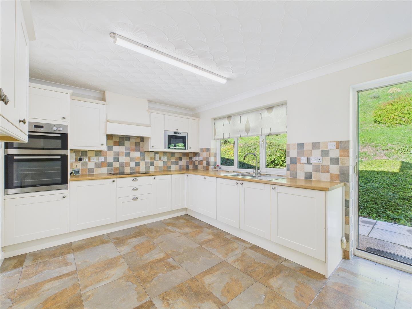 Appointed with a good range of base and eye level storage units with ample work surfacing over and tiled splashbacks. One and a half bowl and drainer stainless steel sink unit with mixer tap. Four ring electric hob with concealed extractor over and eye-level double oven. Integrated eye level microwave and integrated dishwasher. Window and door to rear garden. Tiled flooring. Door to: -