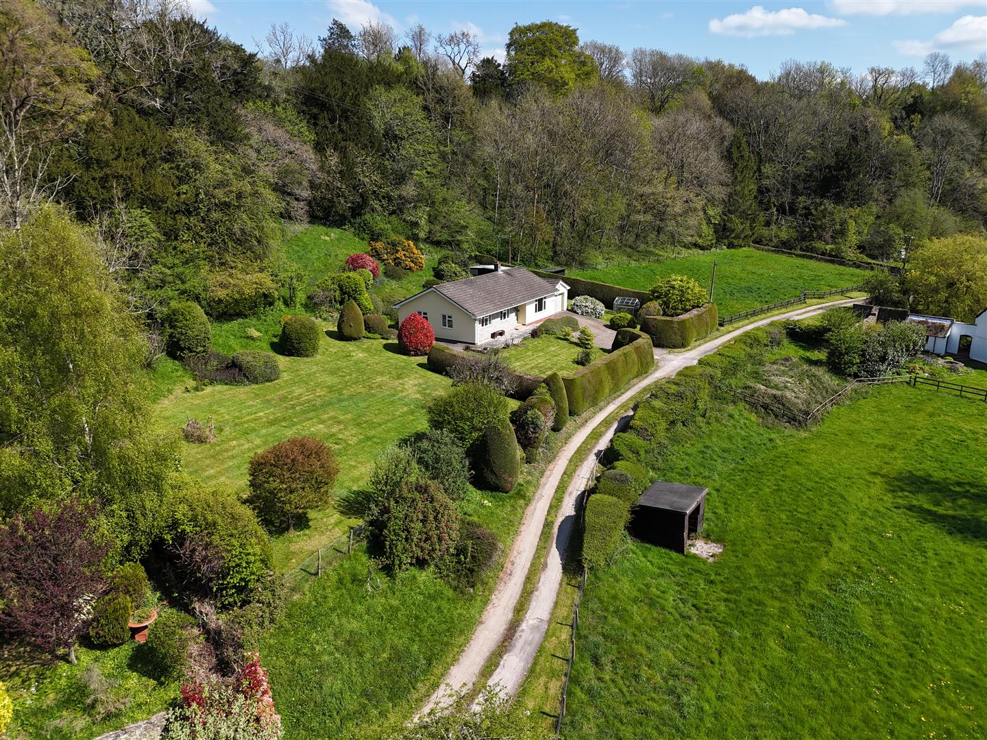 The property stands in very attractive mature gardens approaching approximately one acre. The house is located on a private lane insuring privacy and seclusion. The gardens are generally laid to lawn with attractive sun terrace to the front of the property and a variety of mature trees and shrubs.