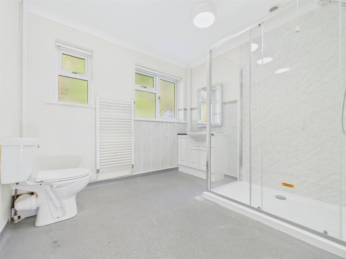 Appointed with a three-piece suite, currently offering step-in shower, low-level WC and vanity wash hand basin set over storage unit. Part-tiled walls. Two frosted windows to rear elevation.