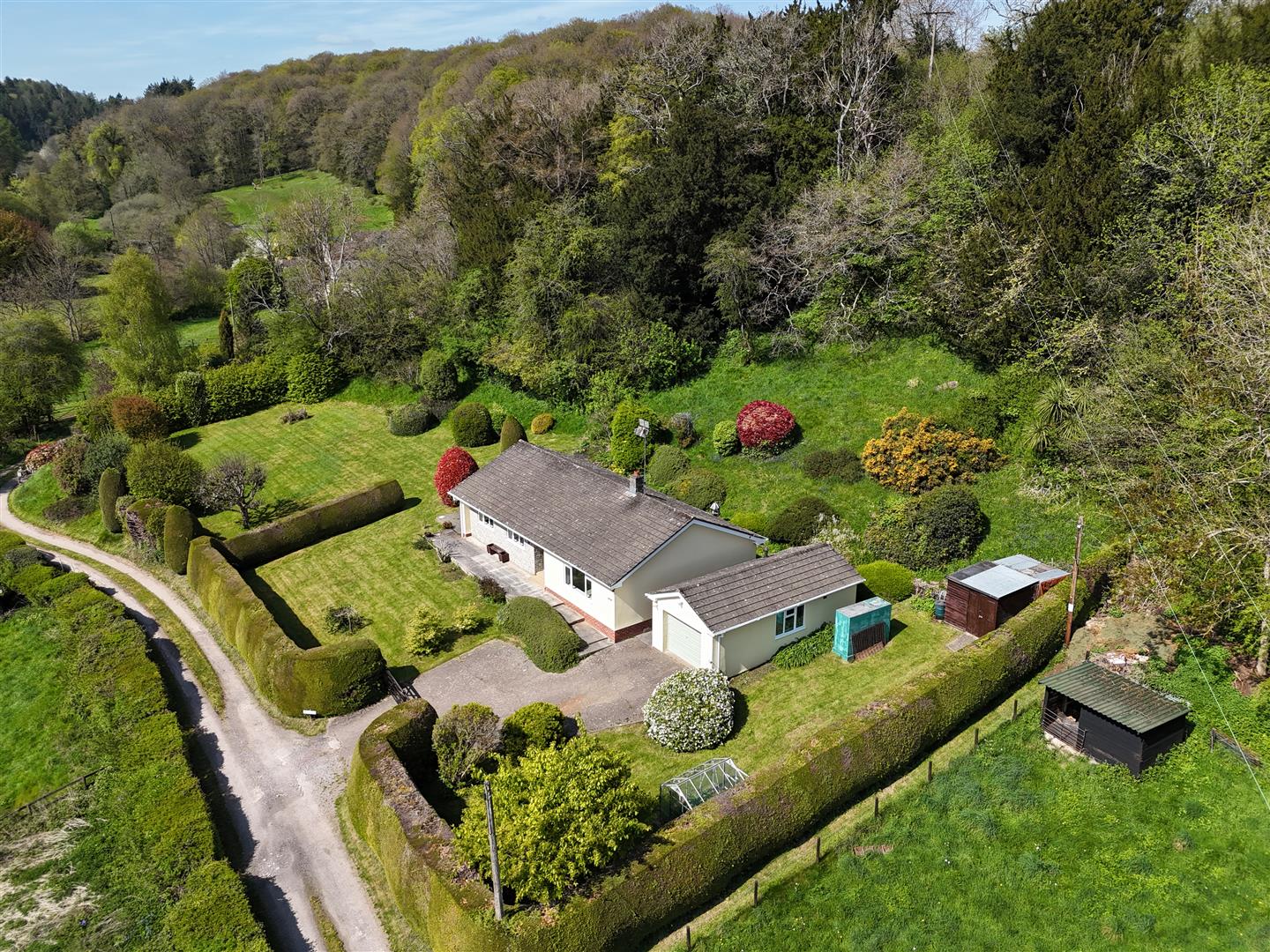 Approached via double entrance gate and private driveway offering parking and turning point, is a detached single car garage with up and over door, power and light and window to side. At the rear of the garage is a useful utility room appointed with one bowl and drainer stainless steel sink unit inset to worktop. Space for washing machine. Range of base and wall units. Window to rear and pedestrian door to side.