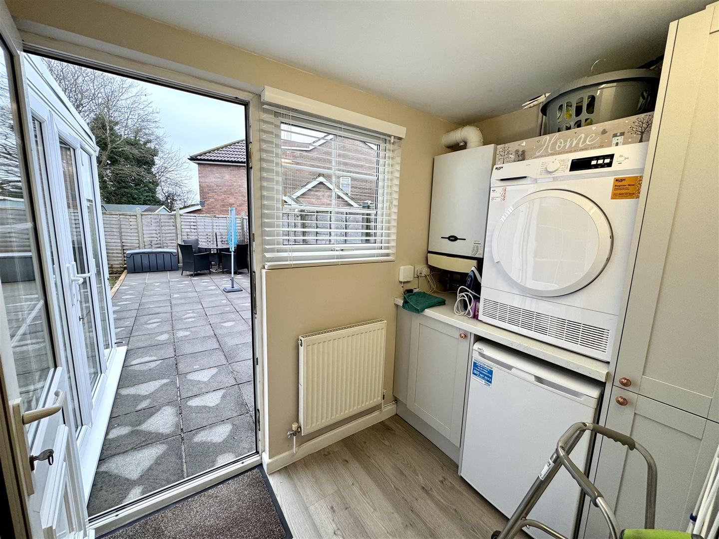 Door and window to the rear garden. Space for under counter freezer, and space for tumble dryer. Baxi combi boiler.