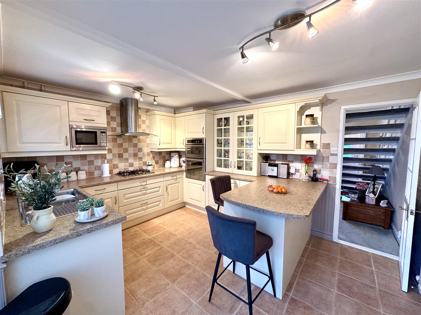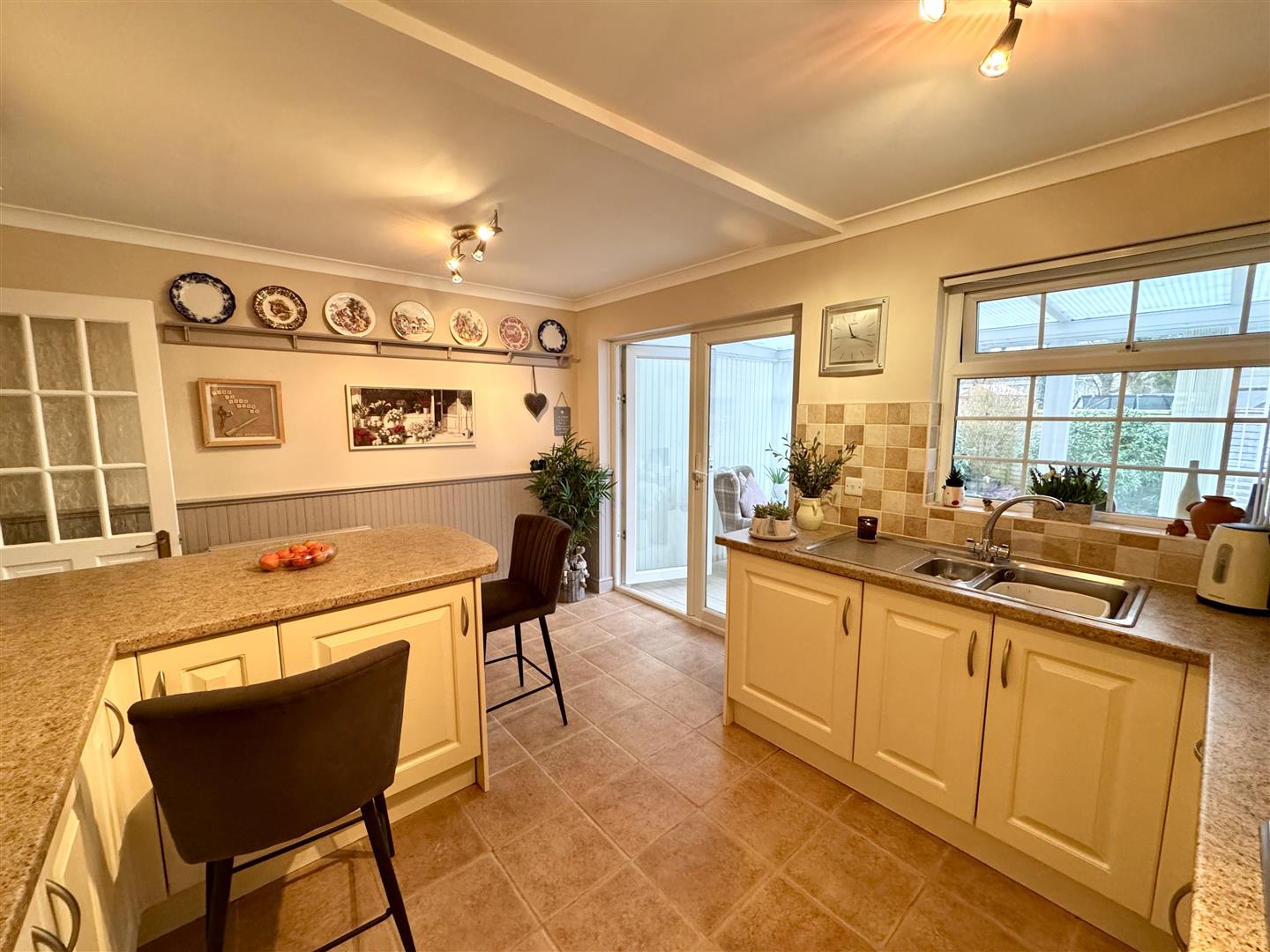 Appointed with an extensive range of wall and base units with ample laminate worktops over with tiled splashback and a feature breakfast bar. Inset one and a half bowl stainless steel sink with drainer. Four ring gas hob with extractor hood over and eye level double oven and grill. Integrated washing machine, Neff microwave and undercounter fridge. Feature tiled flooring. Window and French doors to: -