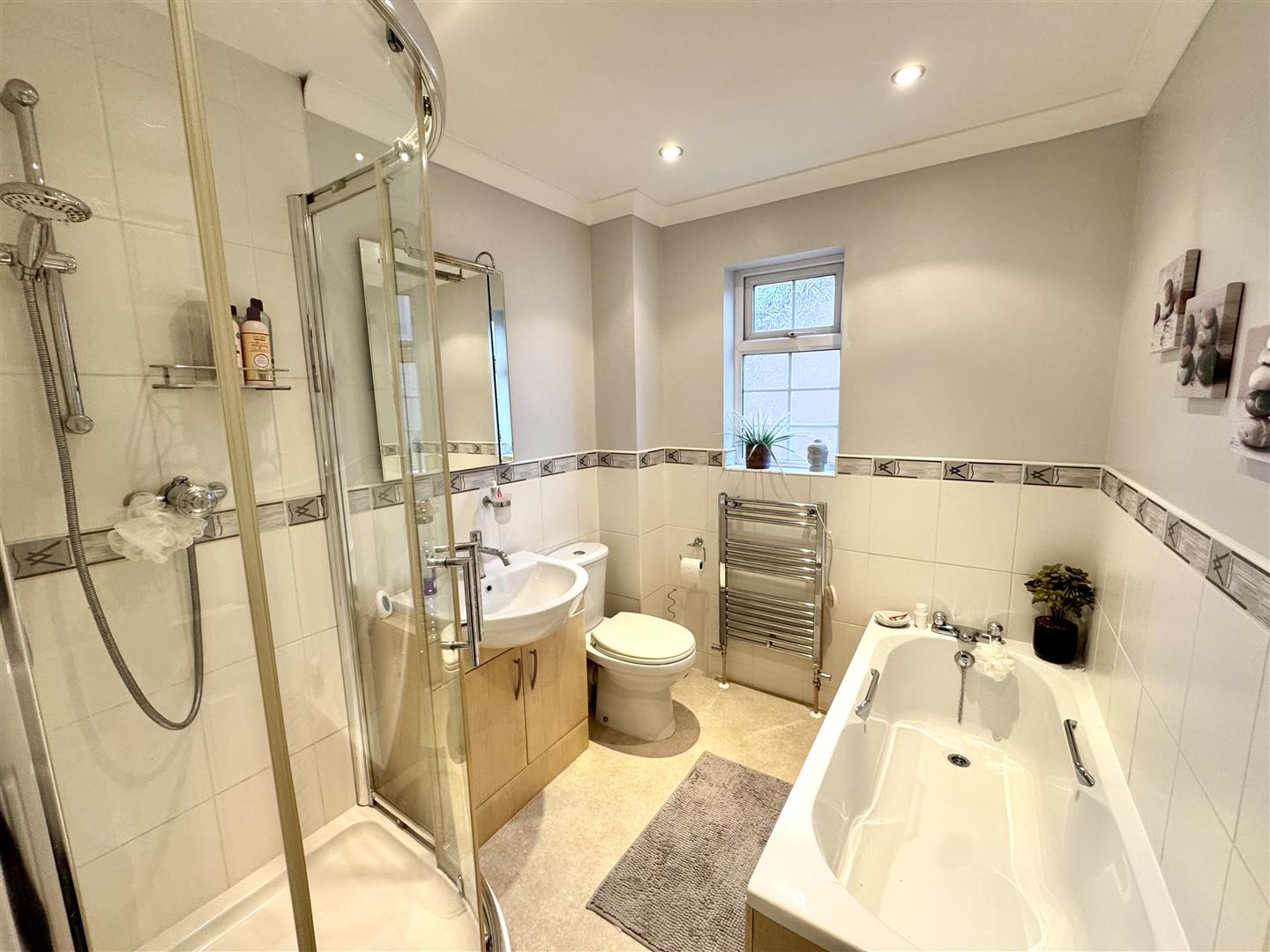 Appointed with a four-piece suite to include panelled bath, walk-in corner shower cubicle with mains fed shower unit and tiled walls, wash hand basin inset to vanity unit with mixer tap, and low-level WC. Wall-mounted heated towel rail. Half-tiled walls. Frosted window to side elevation.