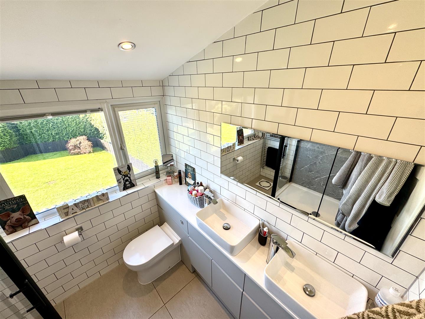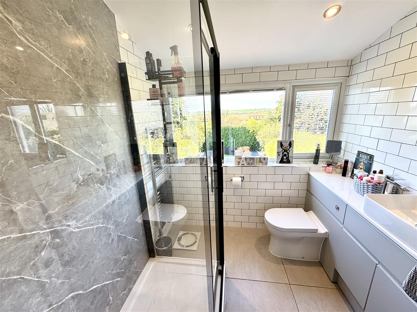Comprising a modern suite to include, low-level WC with concealed cistern, twin wash hand basins with chrome mixer taps set over vanity storage unit and walk-in shower with glass shower screen and water fall shower over. Fully tiled walls. Chrome towel radiator. Window to rear elevation enjoying views over surrounding countryside.