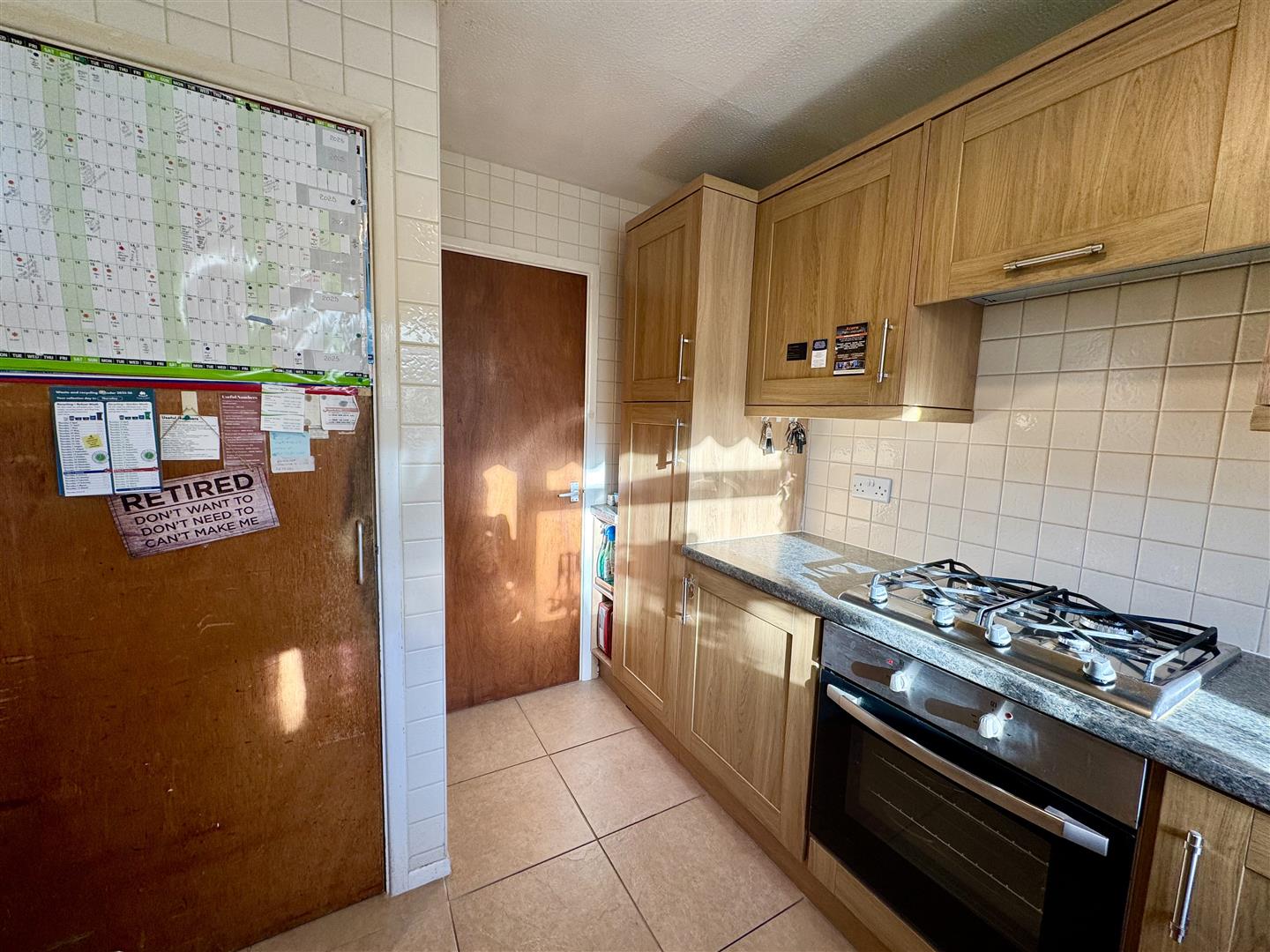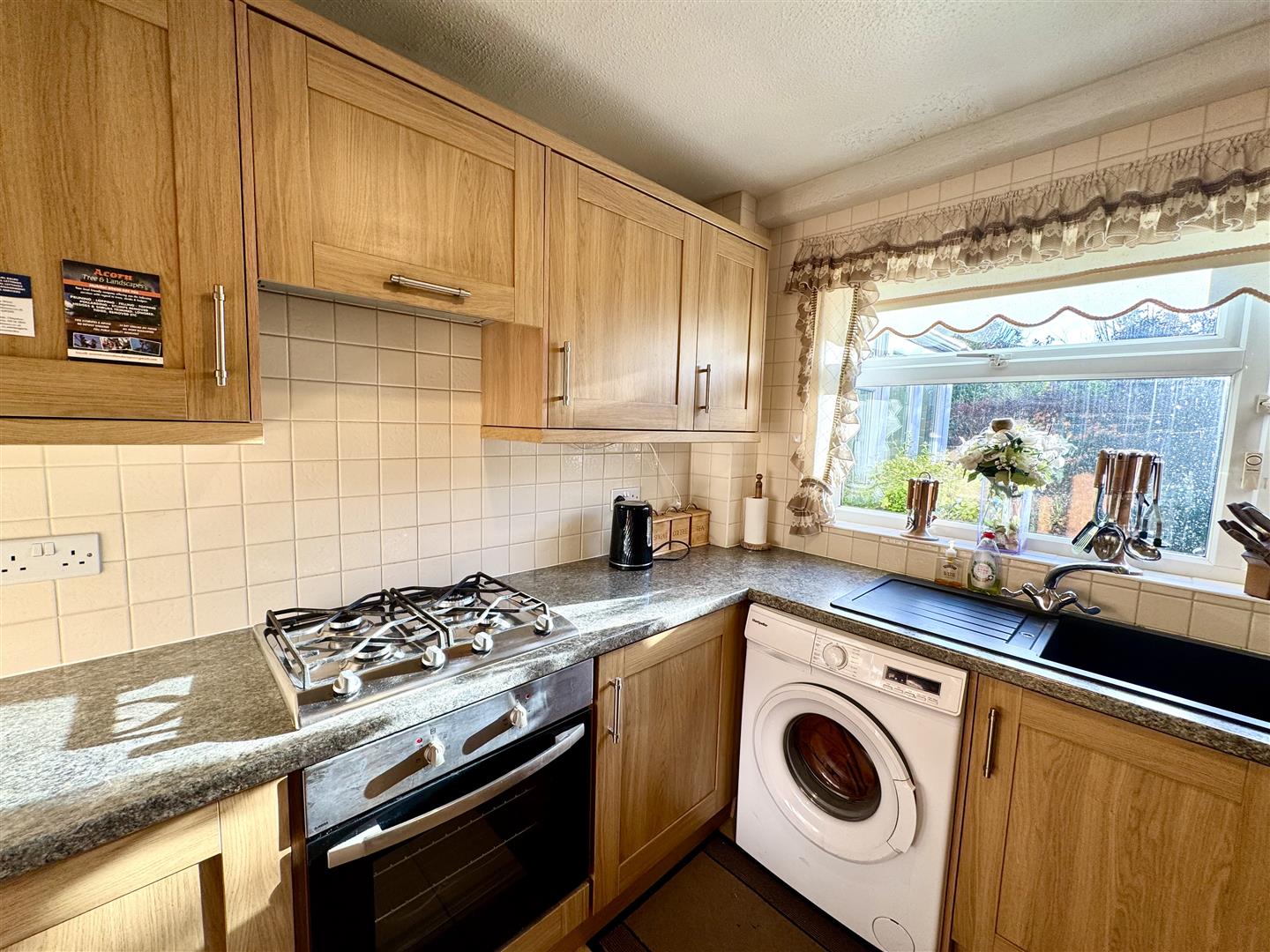 Appointed with a matching range of base and eye level storage cupboards with laminate work surfacing over and tiled splashbacks. One bowl and drainer sink unit with chrome mixer tap. Four ring gas hob with extractor fan over and oven below. Built-in fridge and space for washing machine. Ceramic tiled floor. Handy understairs storage cupboard. Window to rear elevation and door to side elevation.