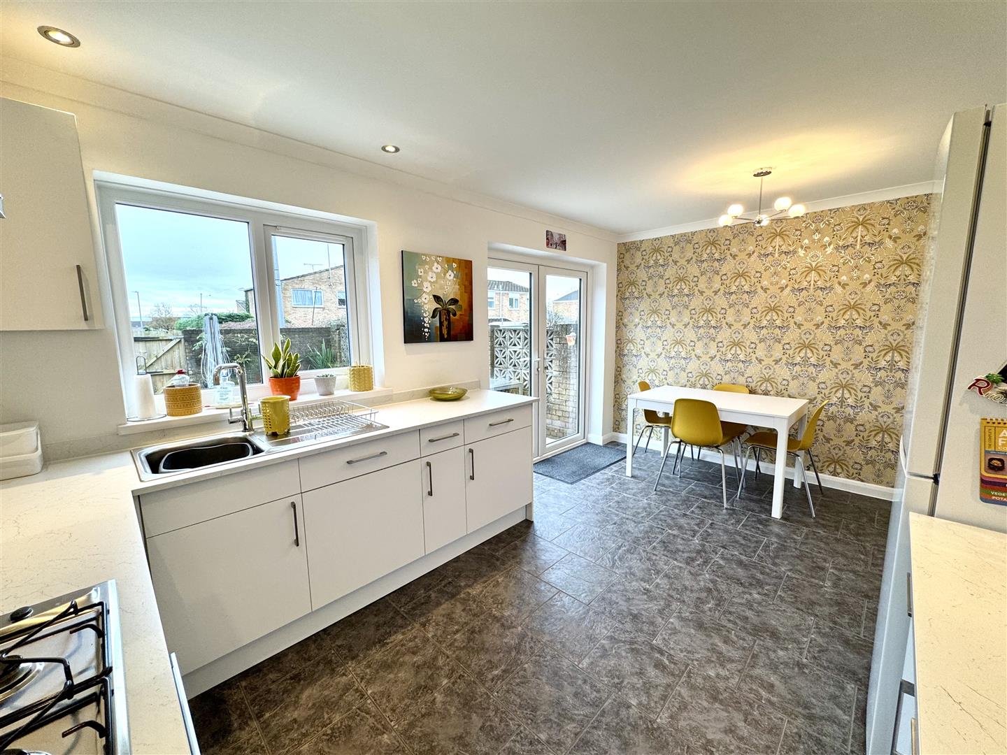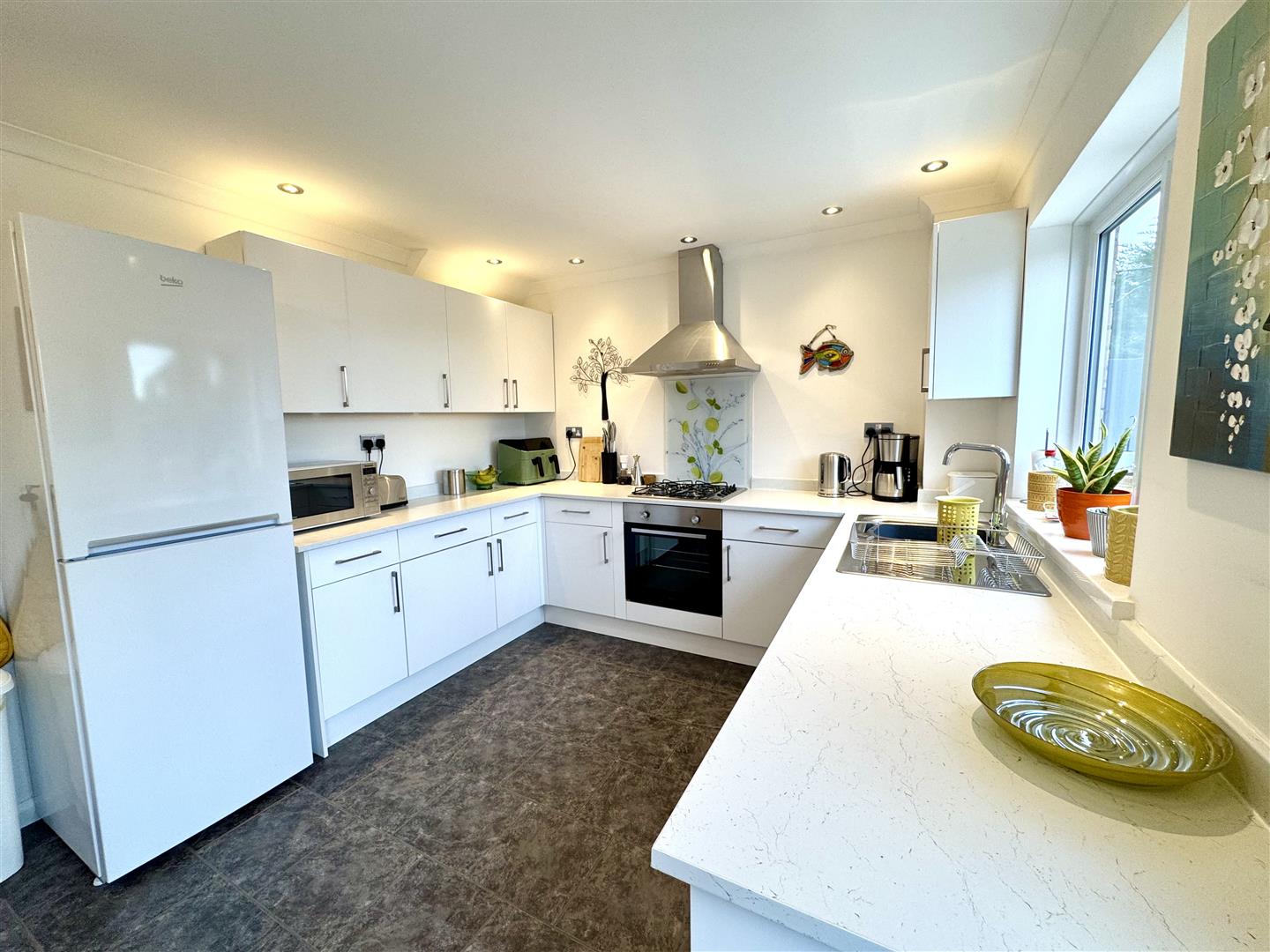 Appointed with a matching range of base and eye level storage units with work surfacing over. One bowl and drainer stainless steel sink unit with mixer tap. Four ring gas hob with extractor hood over and oven below. Built-in dishwasher and space for upright fridge/freezer. Kitchen area benefits from window to rear elevation with French Doors leading from the dining area to the rear garden.