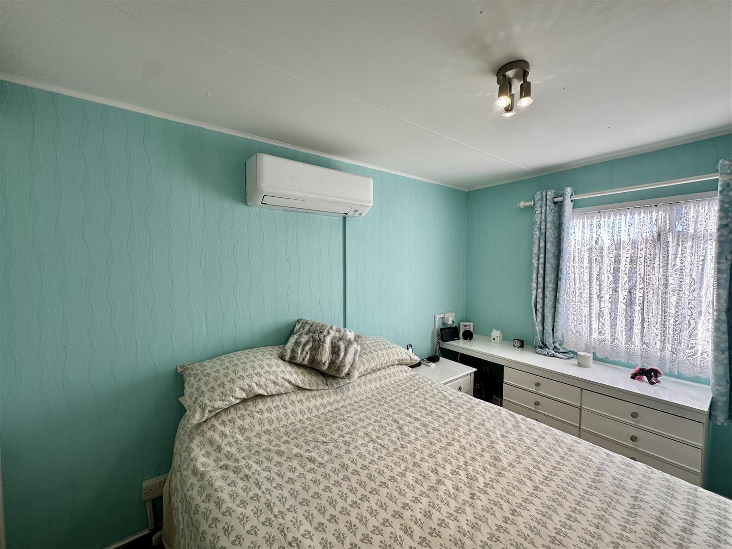 A double bedroom with window to side elevation. Range of built-in bedroom furniture. Air conditioning unit.