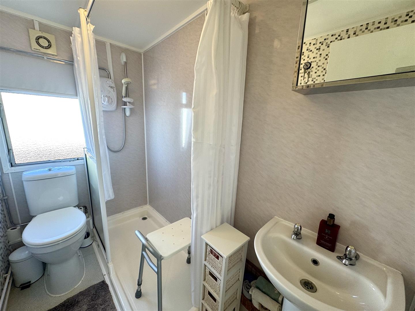 Comprising a three piece suite to include low-level WC, pedestal wash hand basin with chrome taps and a double shower unit with electric shower over. Part-panelled walls. Frosted window to side elevation.