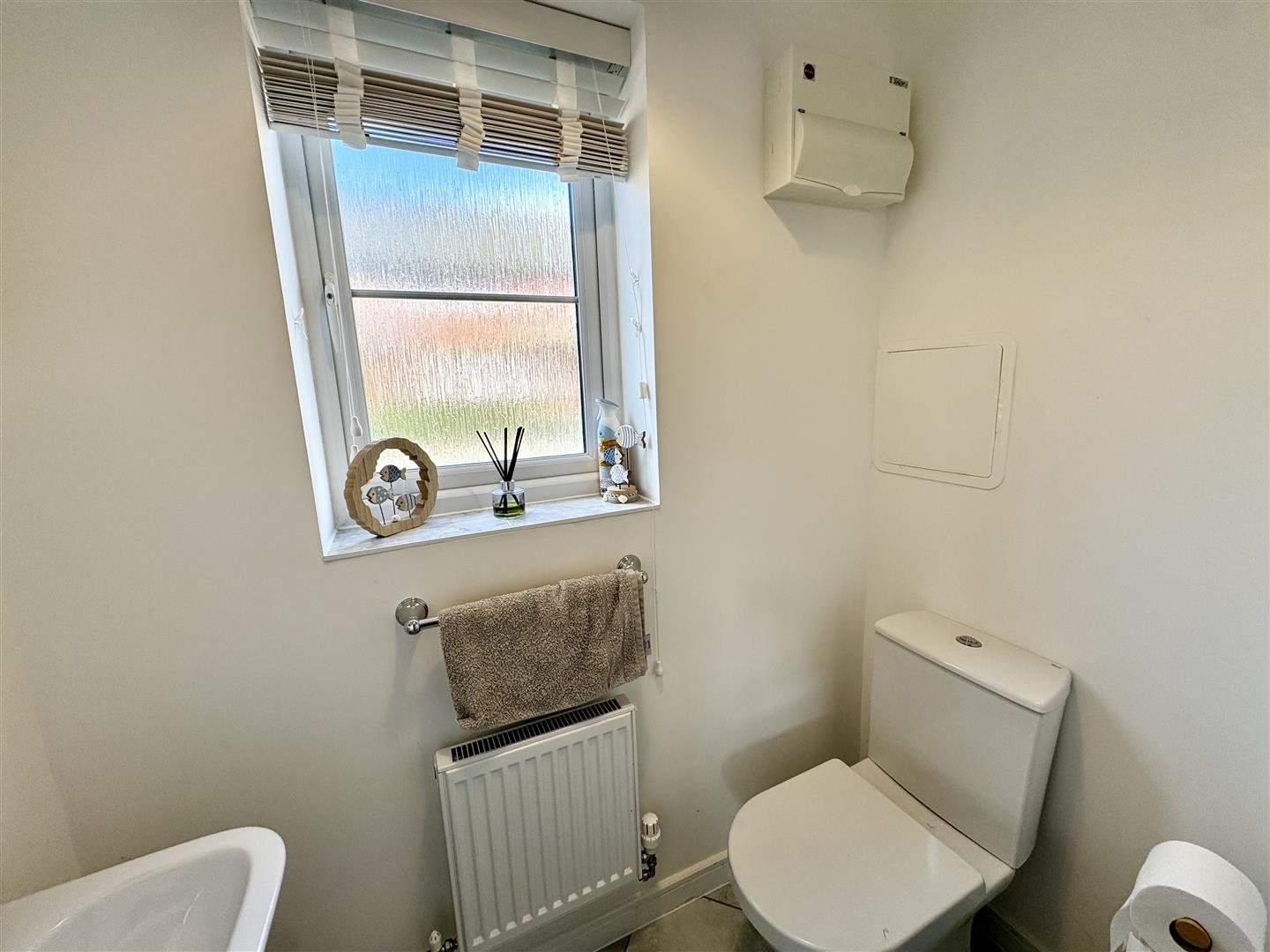 A two-piece suite to include a pedestal wash hand basin with chrome mixer tap and tiled splashback and low-level WC. Frosted window to front elevation.