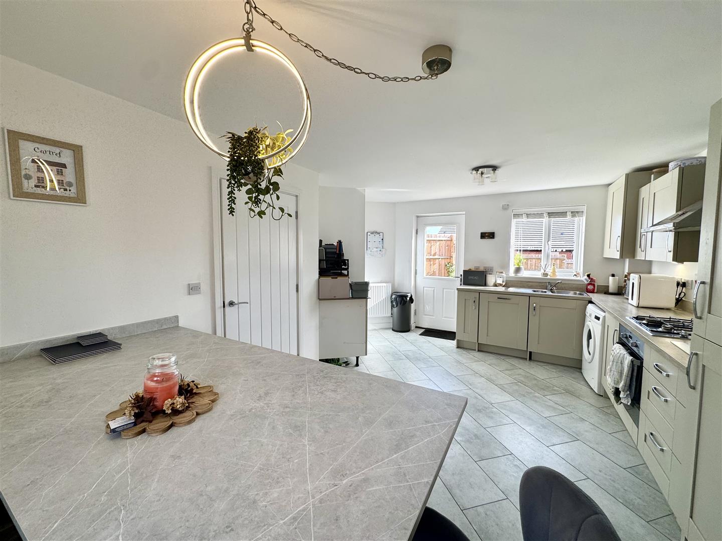 A spacious open-plan kitchen/diner with dual aspect windows to front and rear elevations, and half-glazed door to rear elevation. The kitchen itself is appointed with a good range of eye and base level cupboards with ample wood effect worktop over and upstand. One and a half bowl and drainer stainless steel sink unit with chrome mixer tap. Four ring gas hob with stainless steel splashback and feature extractor fan over, and electric oven below. Built-in fridge/freezer, dishwasher and space for washing machine. There is also a handy peninsula unit perfect for informal dining, with extra storage, plus a wine cooler. Tiled floor. Under-stair storage cupboard.