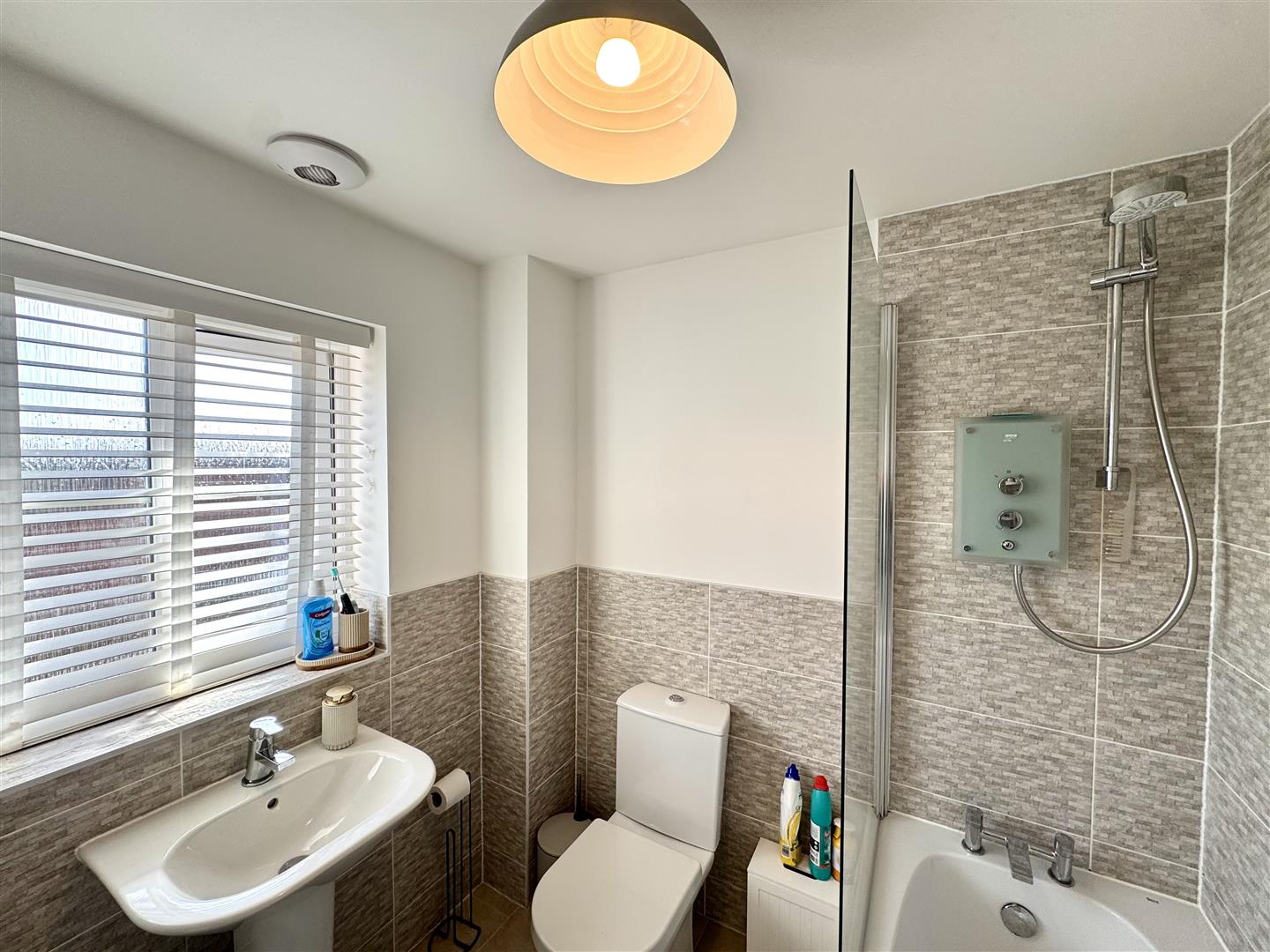 Comprising of a three-piece suite to include panelled bath with chrome mixer tap, and chrome shower attachment over with glass shower screen, low-level WC, and pedestal wash hand basin with chrome tap. Half-tiled walls. Frosted window to rear elevation.