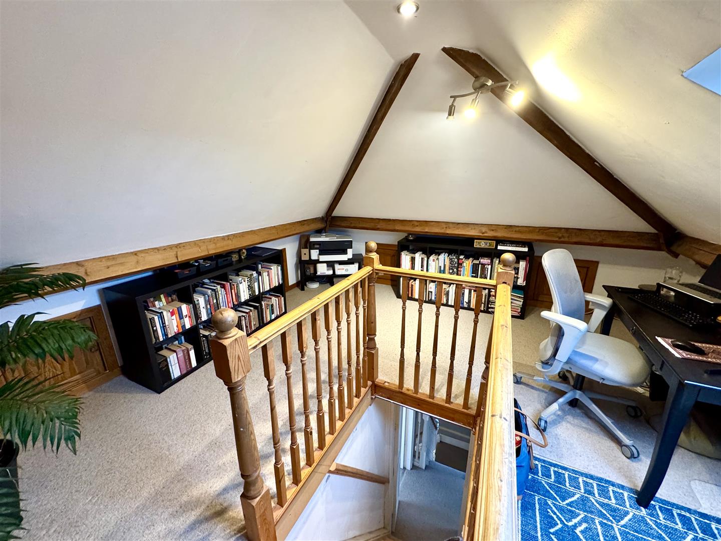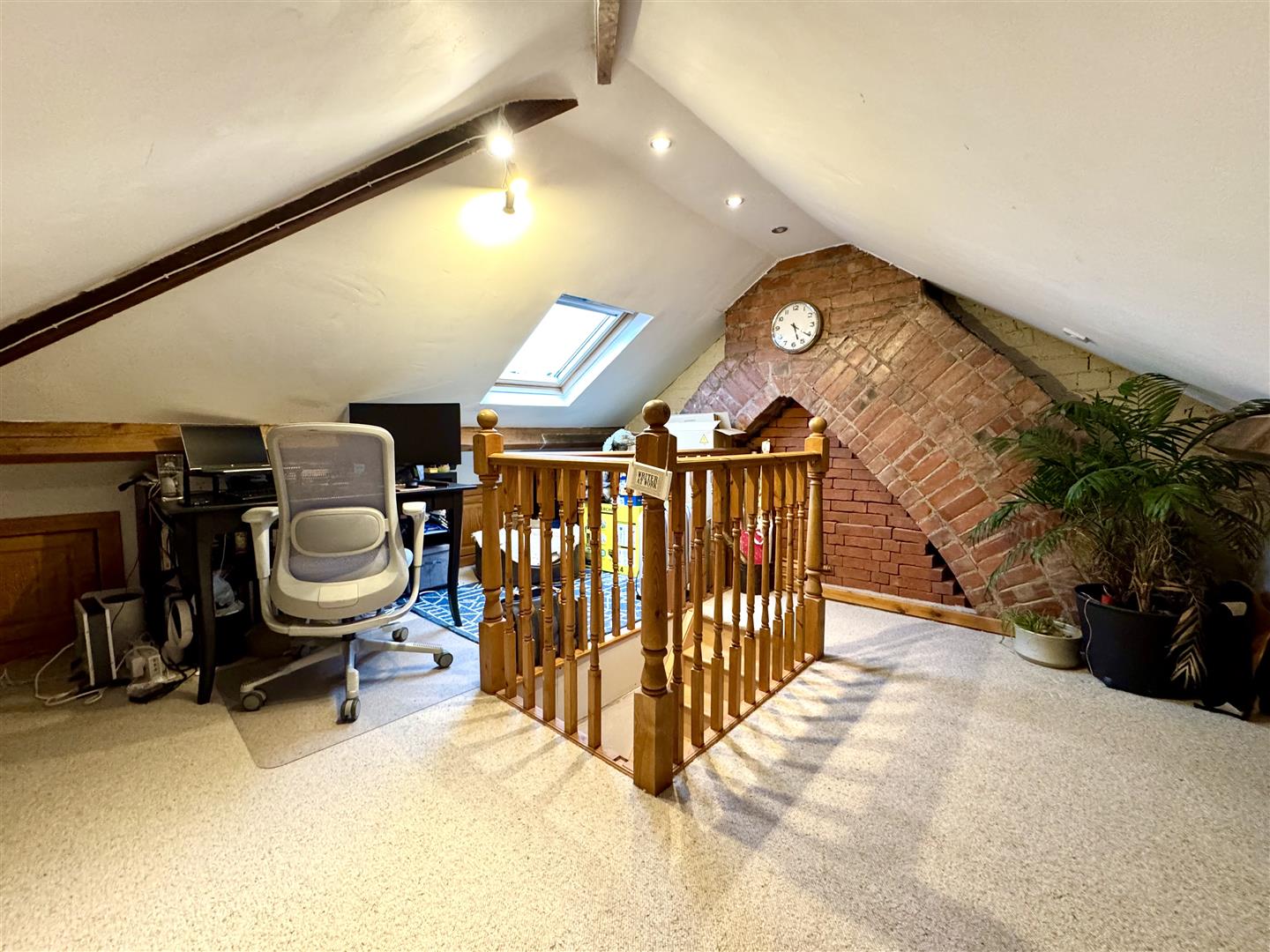 Double doors from the first floor landing and staircase lead up to the loft room which provides an additional flexible space currently utilised as a library and study but has potential to be converted into a third bedroom subject to the necessary consent. Velux window to the rear aspect. Eaves storage. Feature exposed brick wall to one side.