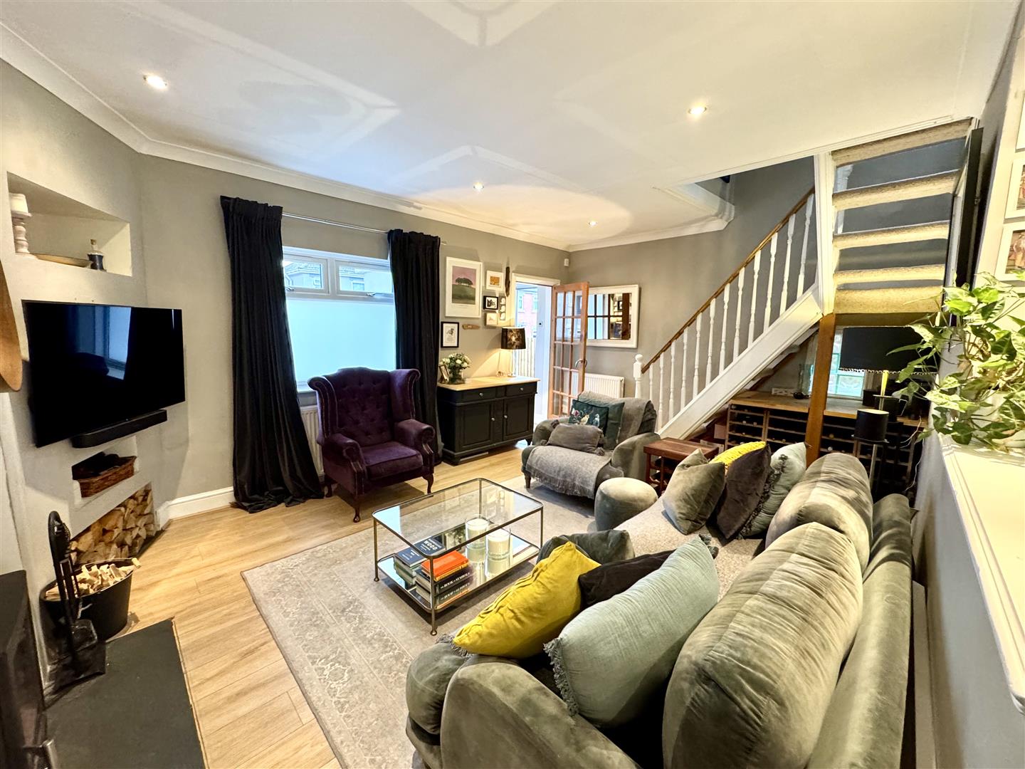 A well-proportioned reception space enjoying a large picture window to the front aspect and stained glass window to the side. A feature free standing wood burner on a slate hearth. Wood effect laminate floor. Staircase to first floor. Open plan to:-