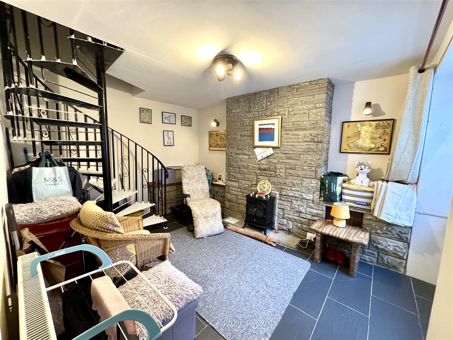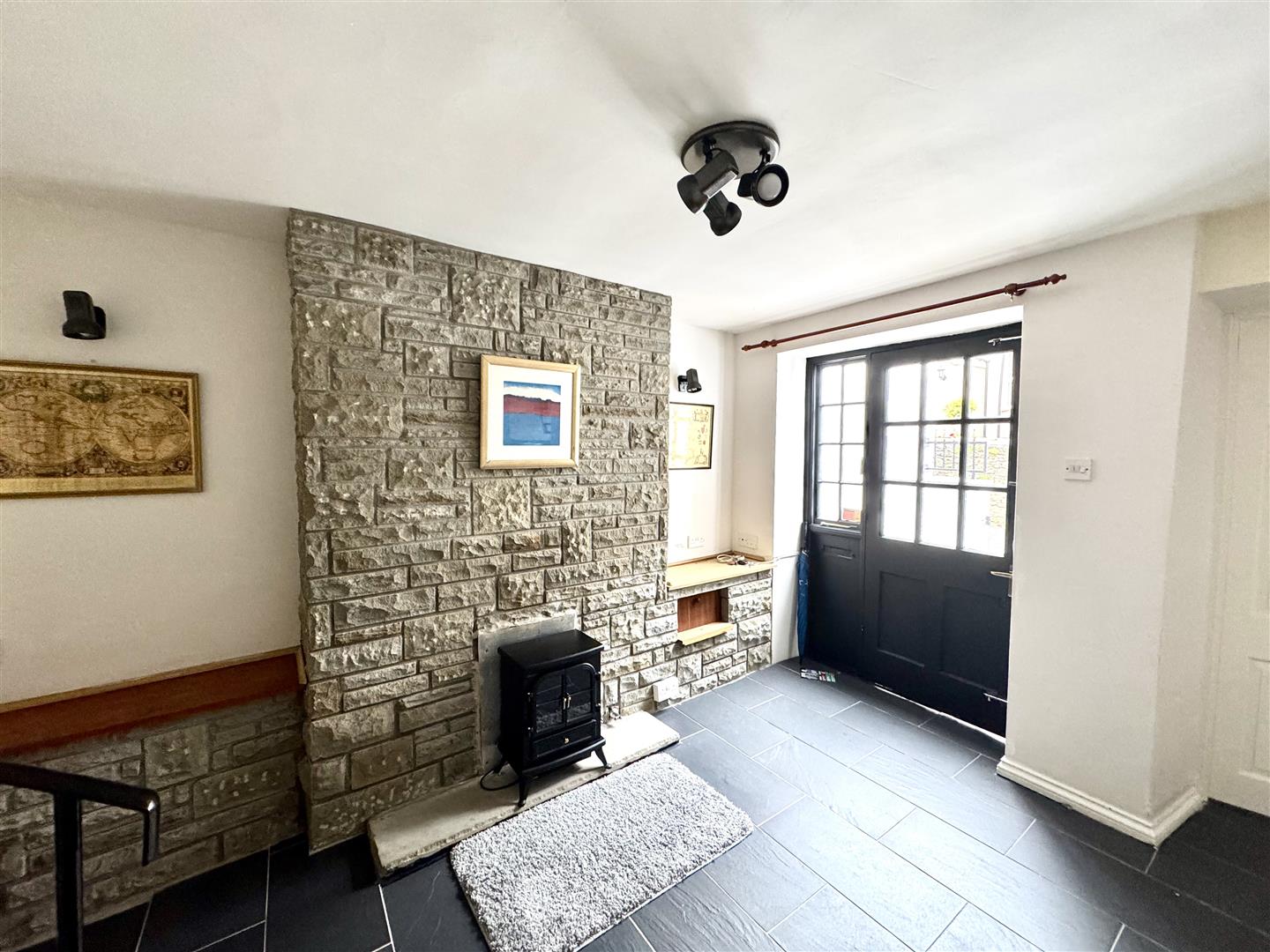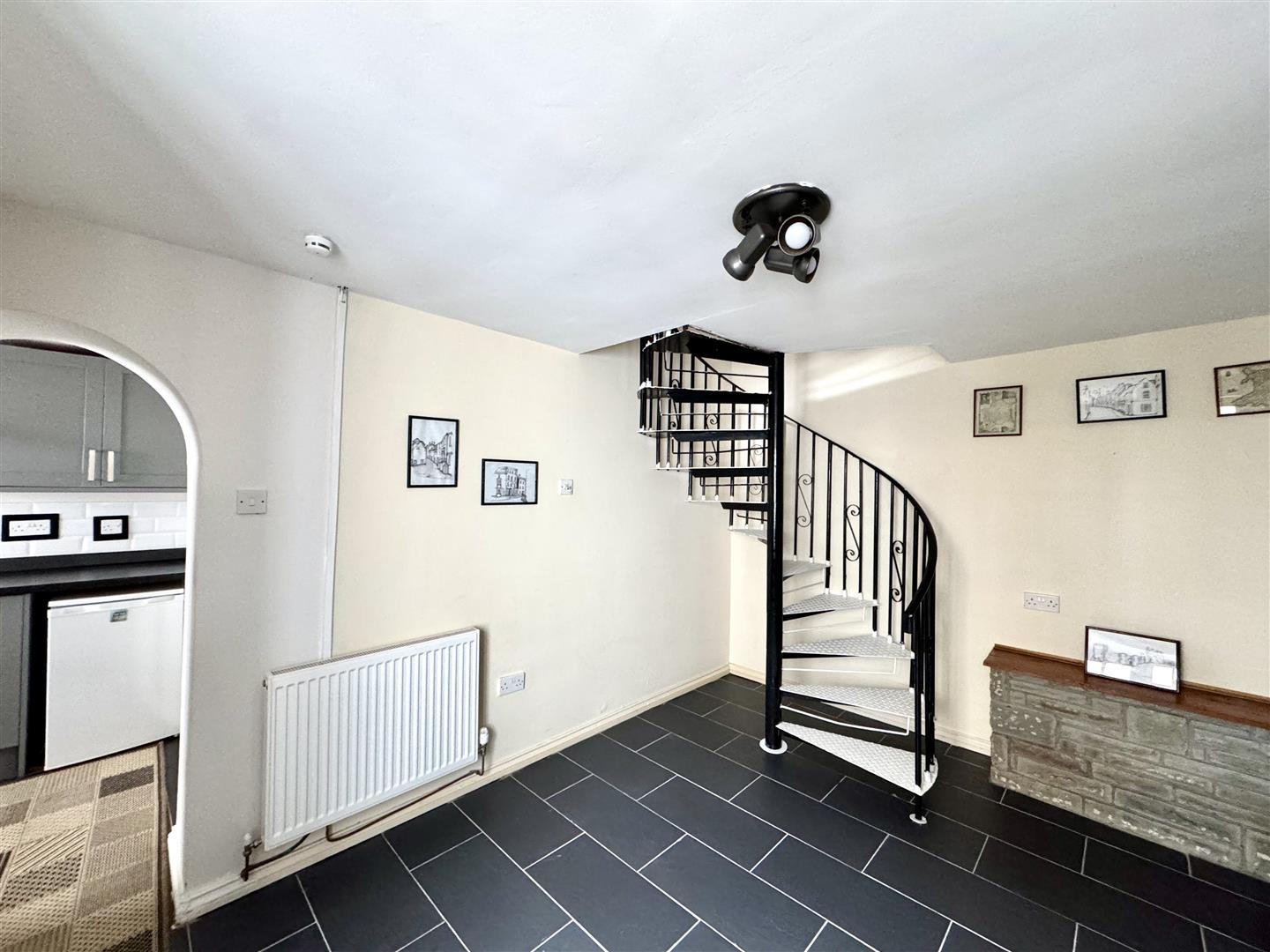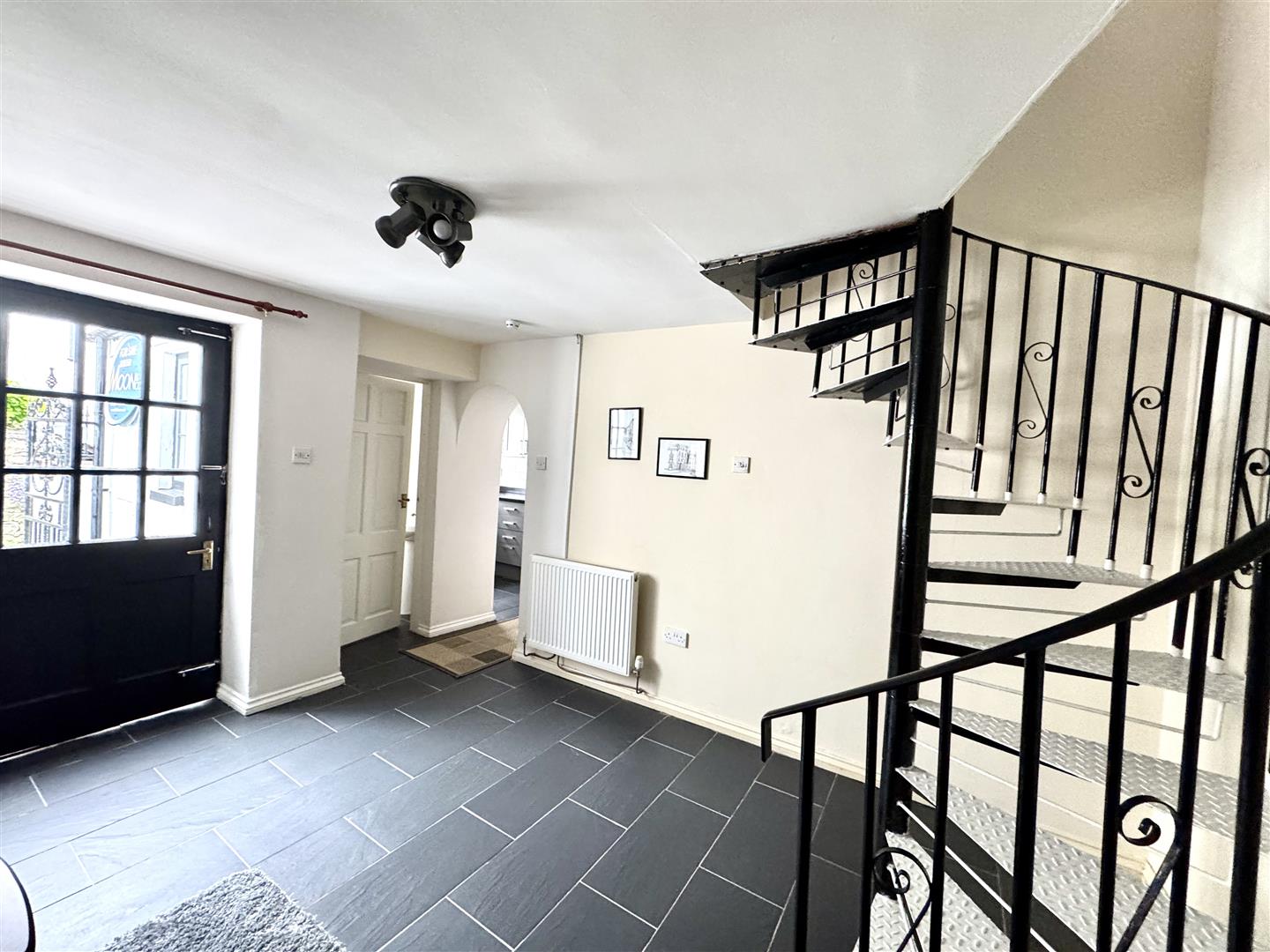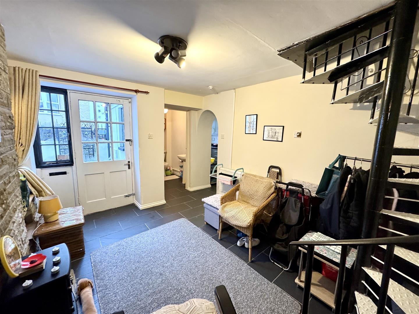 Wooden glazed entrance door leads through to a good size reception space with tiled floor, feature exposed stone fireplace with feature free standing electric fire (to remain). Spiral staircase leading to the first floor. Open archway to: -