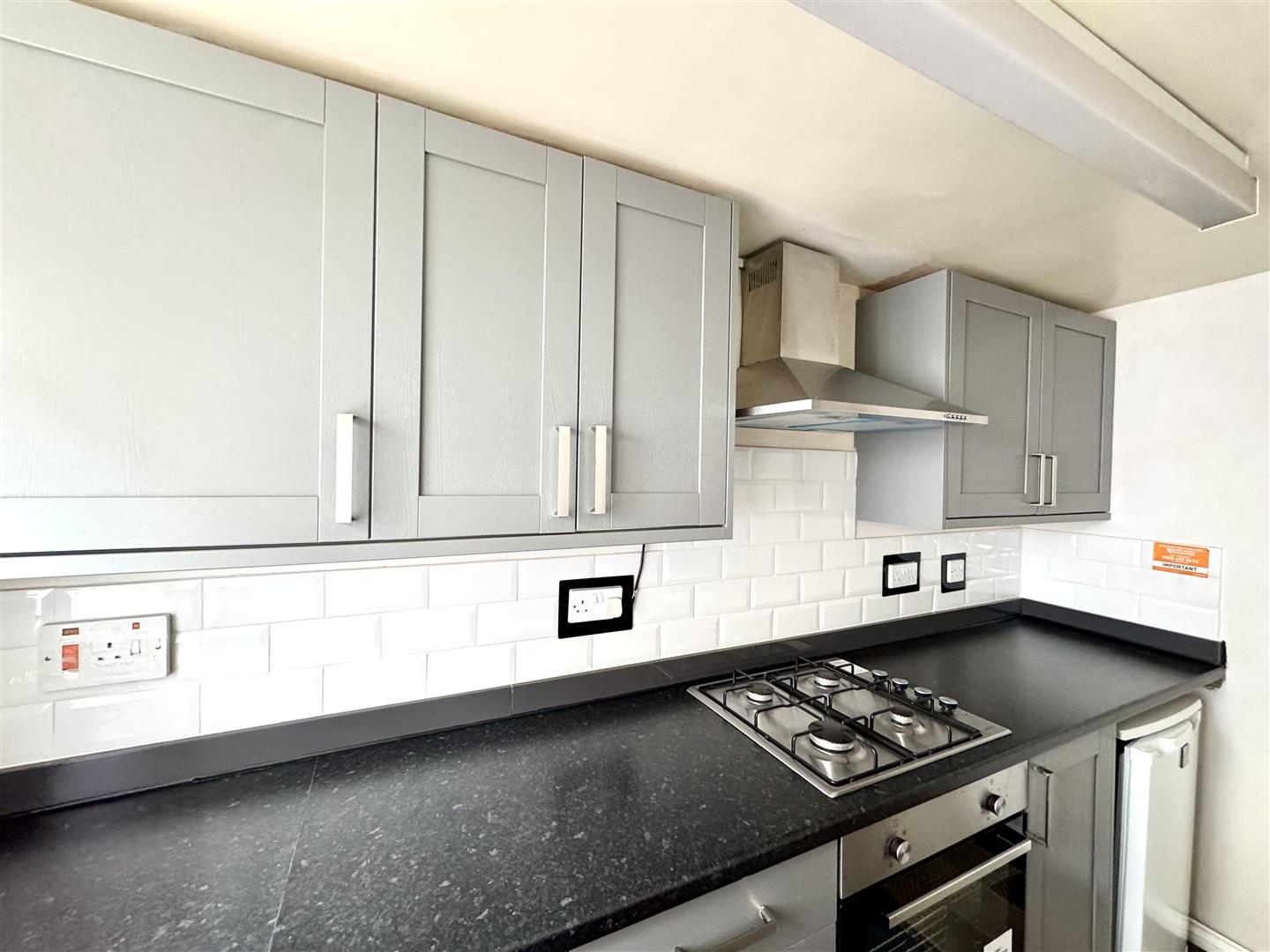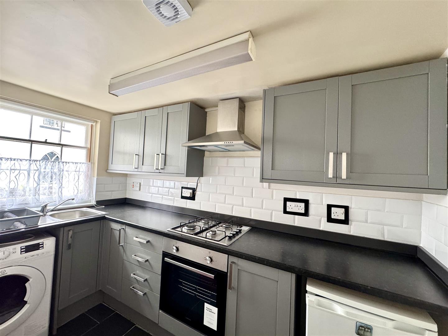 A modern kitchen appointed with a matching range of base and eye level storage units with ample laminate work surfacing over and tiled splashbacks. Four ring gas hob with extractor hood over and oven below. One bowl and drainer stainless steel sink unit with mixer tap. Space for washing machine and undercounter fridge (both to remain if required). Sash window to front elevation.