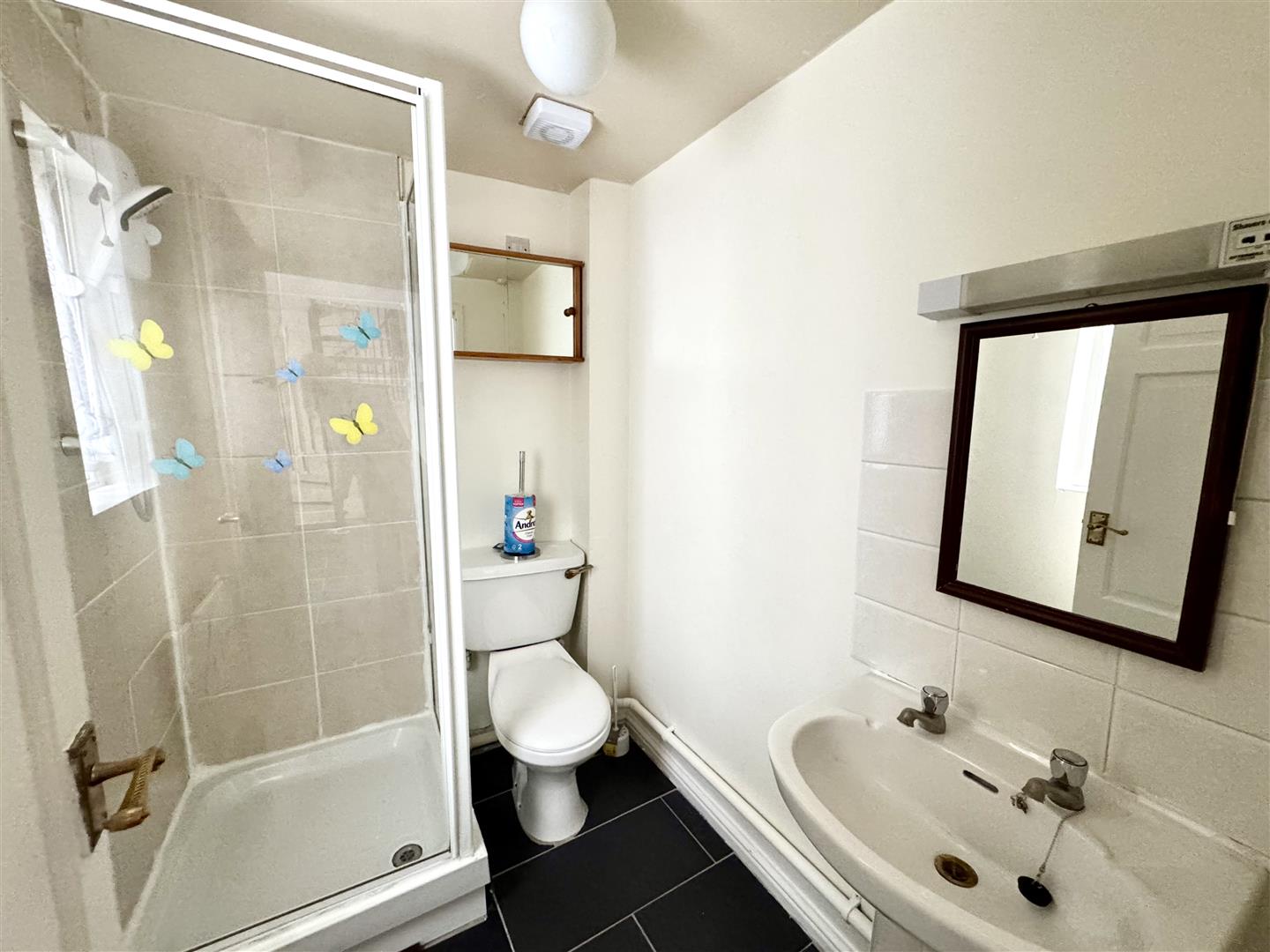 Appointed with a three-piece suite to include low-level WC, pedestal wash hand basin with chrome taps and tiled surround, walk-in shower cubicle with mains fed shower unit and tiled surround. Window to side elevation. Tiled flooring.