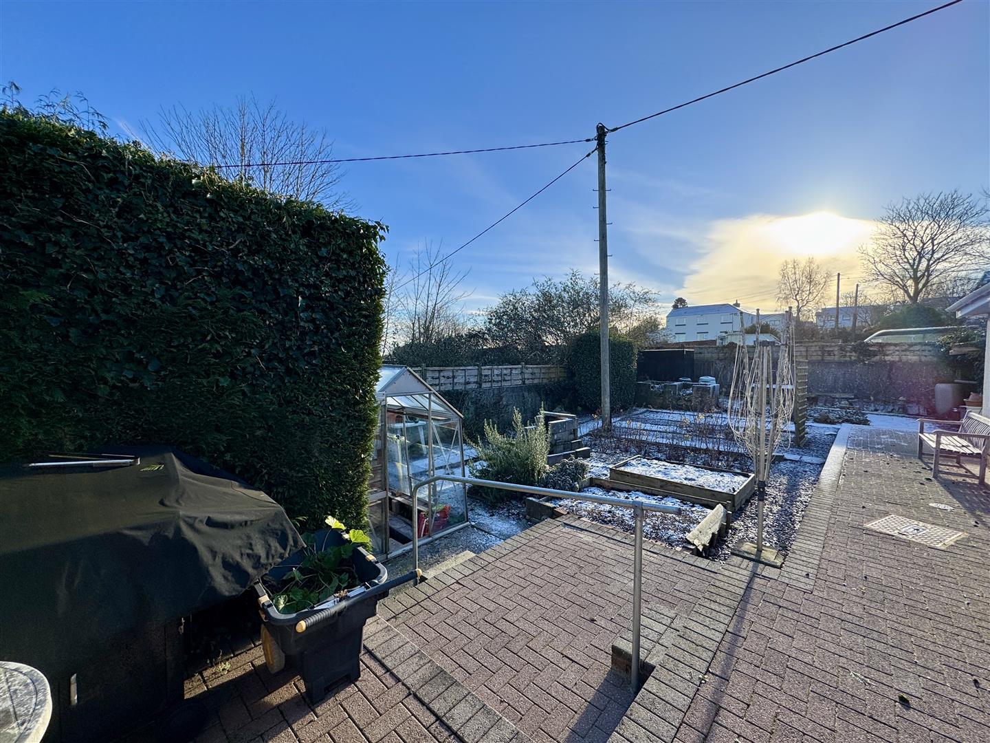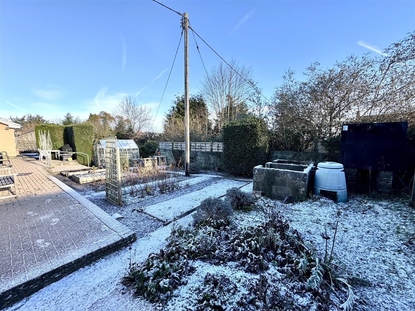 To the front a paved pathway leads to the front entrance door with a further paved pathway and double driveway providing off-street parking, giving access to the double garage, lawned area and mature shrubs. The rear garden benefits from a large raised terrace with steps down to a lower lawn area with mature borders along with a cultivated vegetable area with greenhouse.