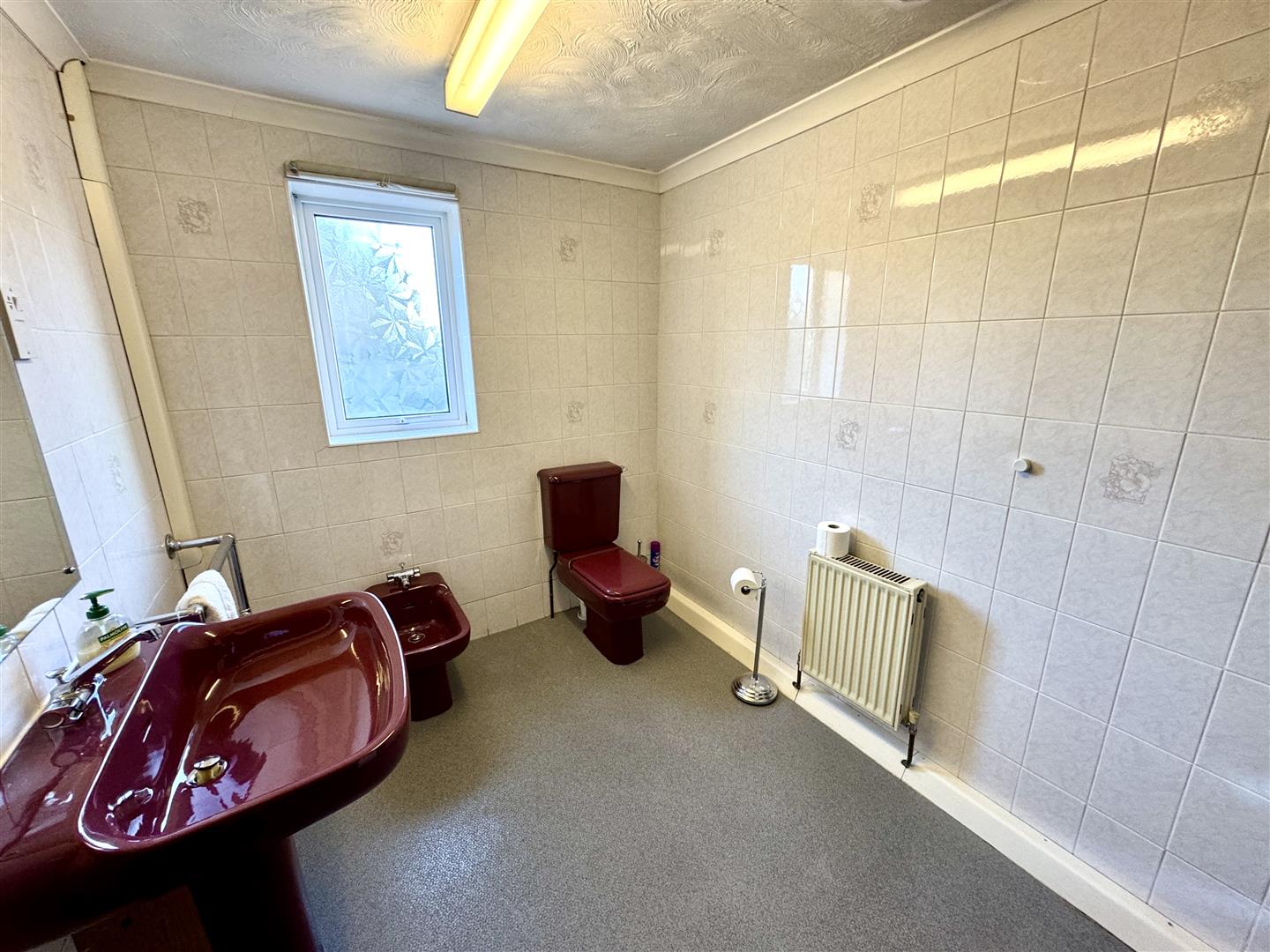 A spacious shower room comprising a four-piece suite to include pedestal wash hand basin, low-level WC, bidet and step-in shower unit. Window to rear elevation and fully tiled walls.