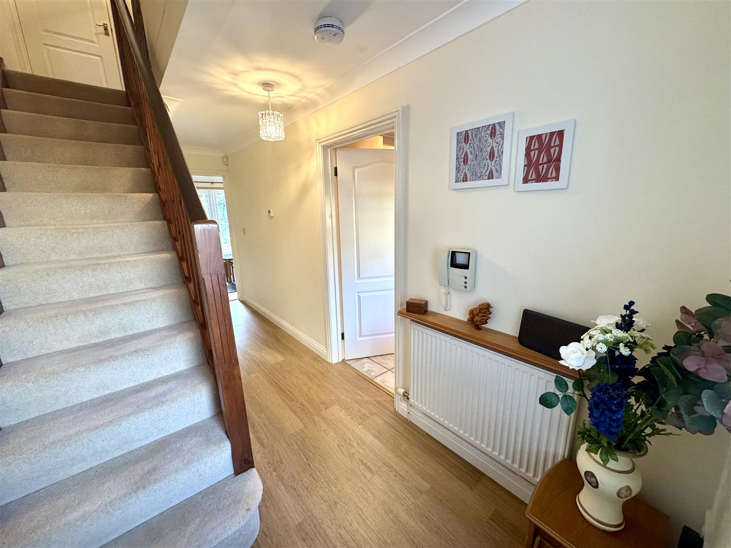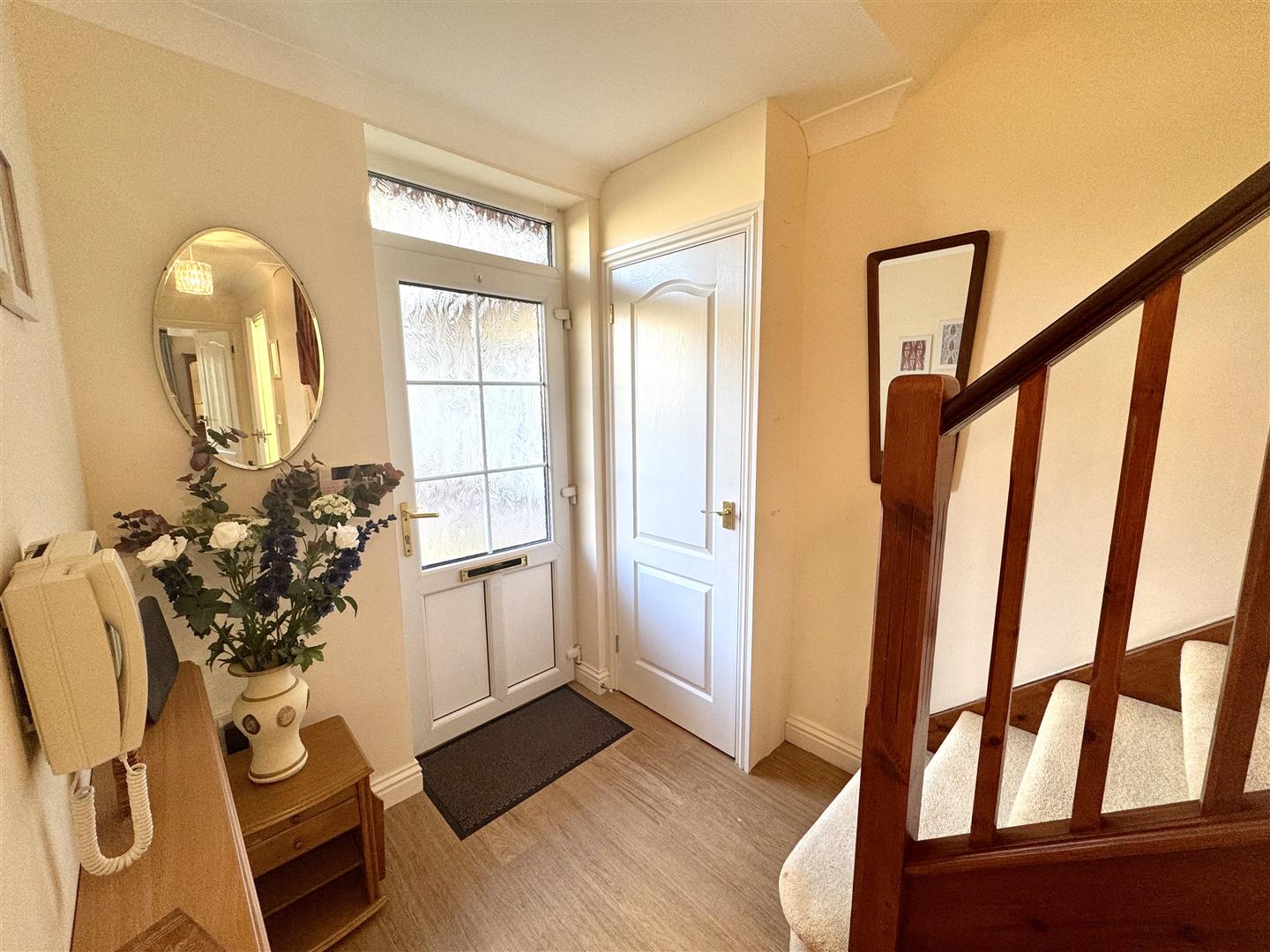 A welcoming and spacious entrance hall with part glazed uPVC entrance door, useful built-in storage cupboard housing electric meter and inset shelving, and a built-in under stairs storage cupboard. Wood effect laminate floor and staircase leading to the first floor landing.