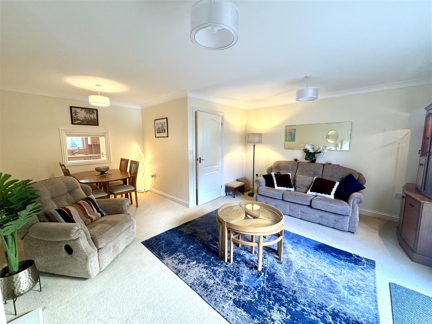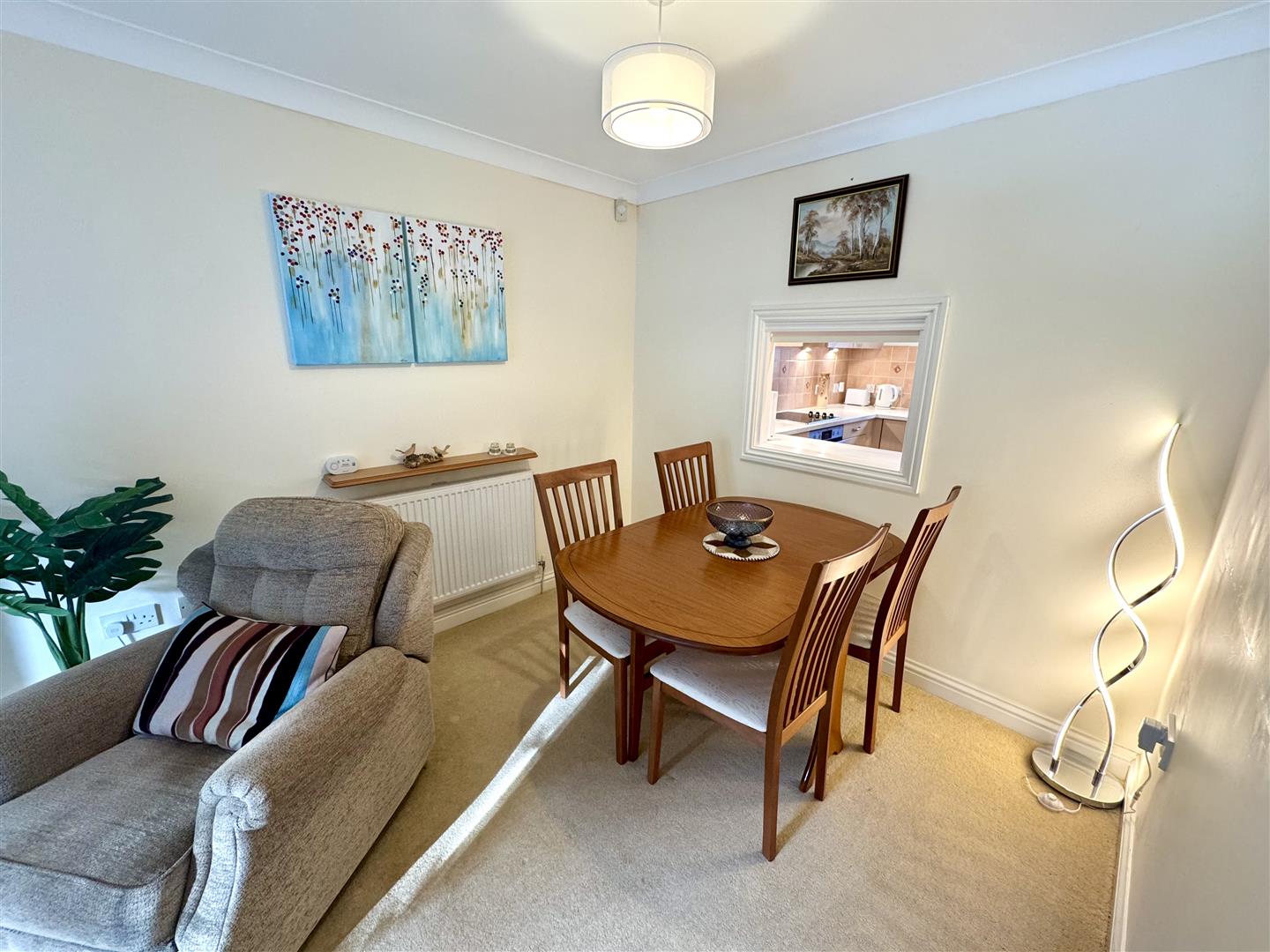 Comprising an extensive range of fitted wall and base wooden units with ample laminate worktop and tiled splashback, inset one and a half bowl stainless steel sink with drainer and mixer tap. Integrated four ring electric hob with concealed extractor hood over and electric oven and grill beneath, integrated full height fridge/freezer, integrated under counter freezer and an integrated washing machine. Window to the front elevation enjoying uninterrupted views across the beautiful communal courtyard. Open hatch through to the dining area. Tiled flooring. Glow-Worm gas boiler fitted July 2025 with a 5 year warranty.