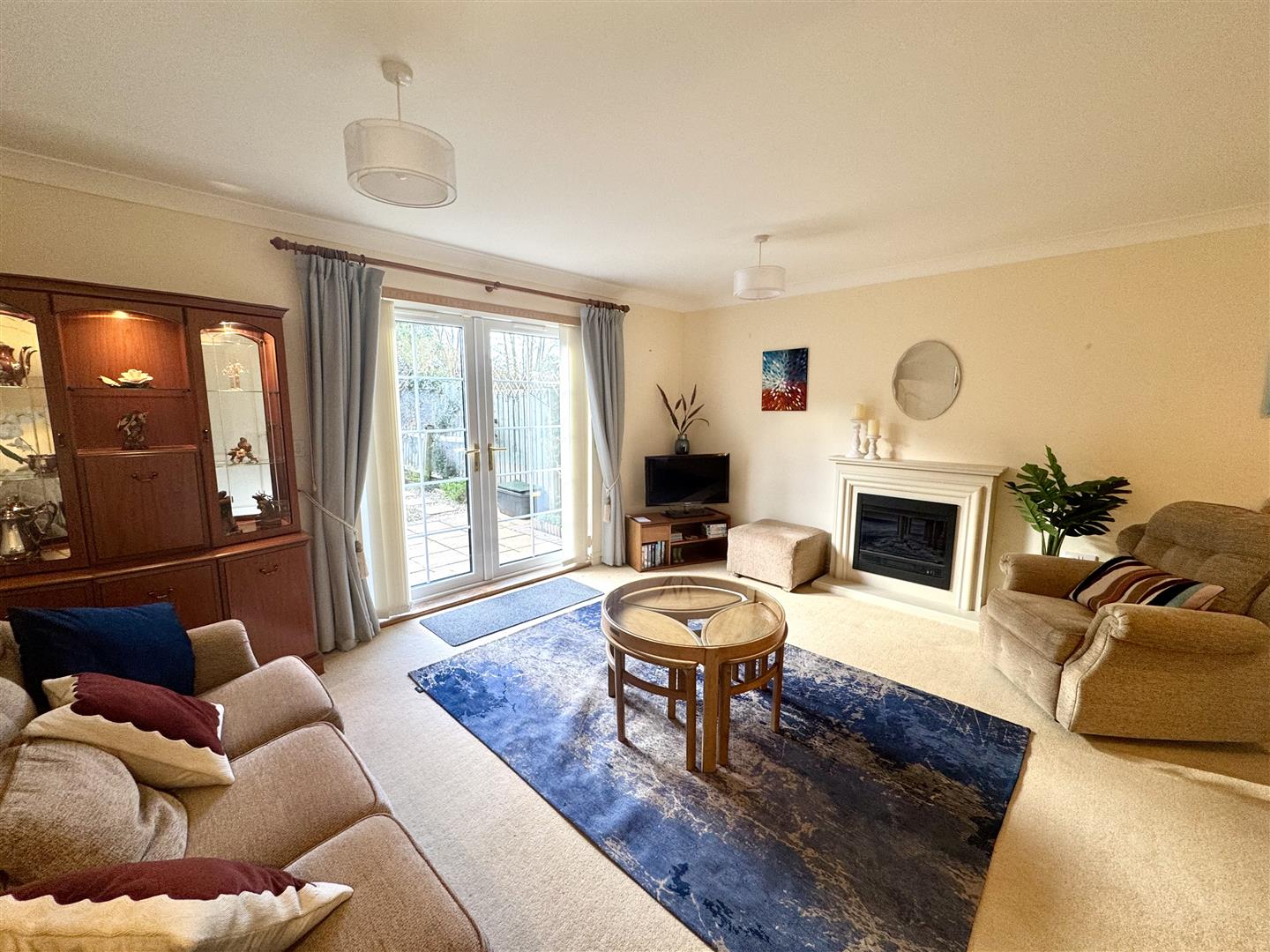 Enjoying a feature fireplace with surround and French doors leading out to the south facing rear garden.