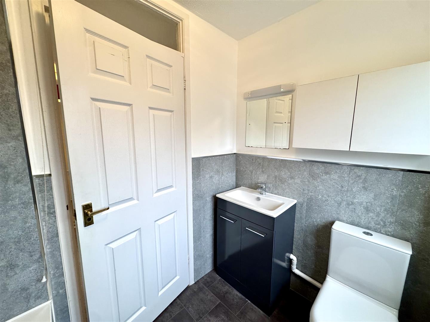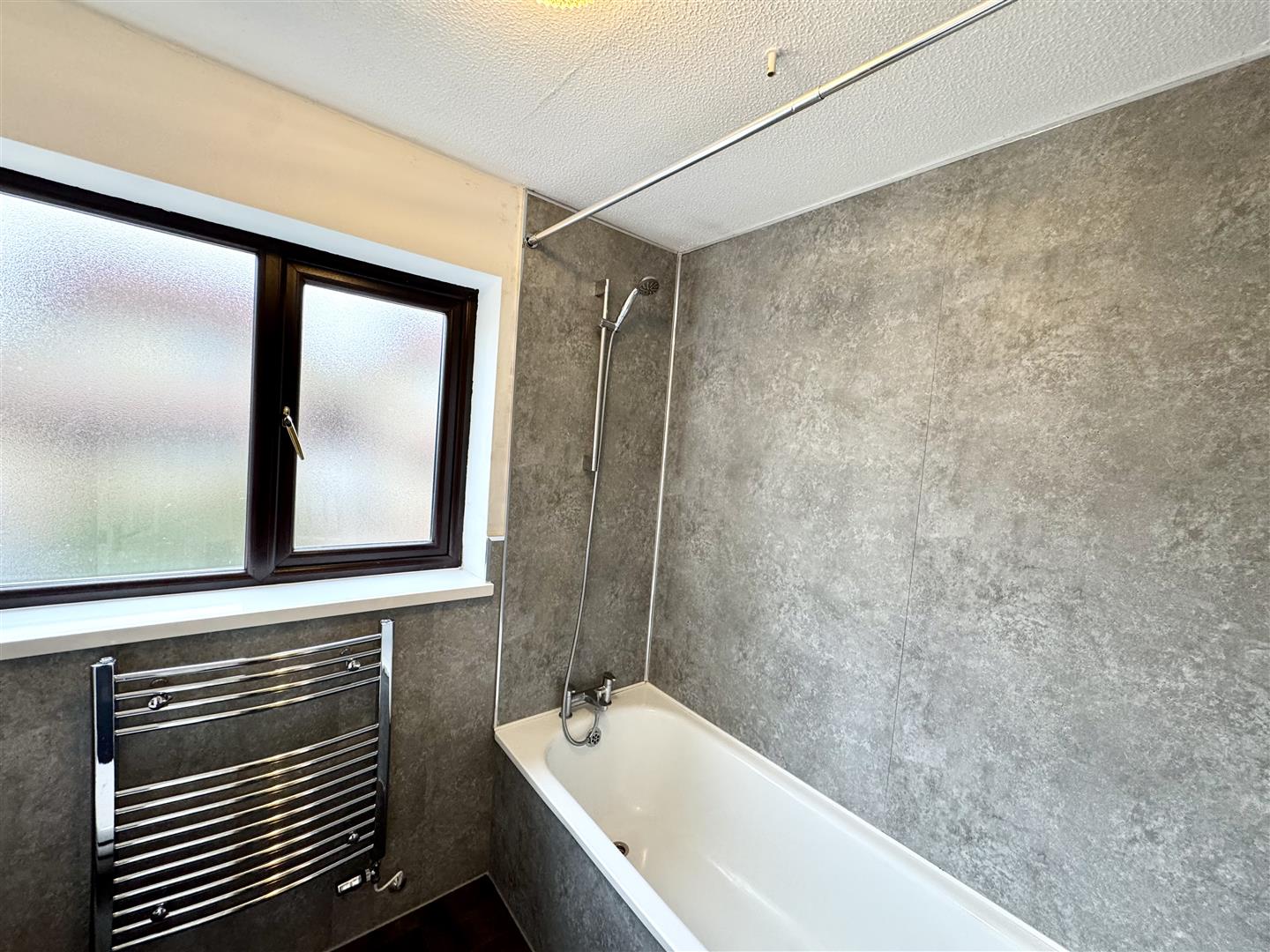Comprising of a three-piece suite to include panelled bath with chrome shower attachment over, wash hand basin inset to vanity storage unit with chrome mixer tap and low-level WC. Chrome heated towel rail and half panelled walls. Frosted window to side elevation.