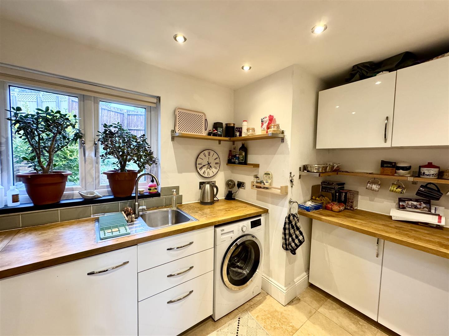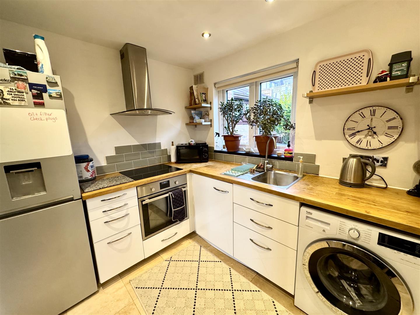 Appointed with a matching range of base and eye level storage units with ample wooden work surfacing over. One bowl and drainer stainless steel sink unit with mixer tap. Four ring electric hob with extractor over and oven below. Space for full height fridge/freezer and washing machine. Tiled floor and window to rear elevation.