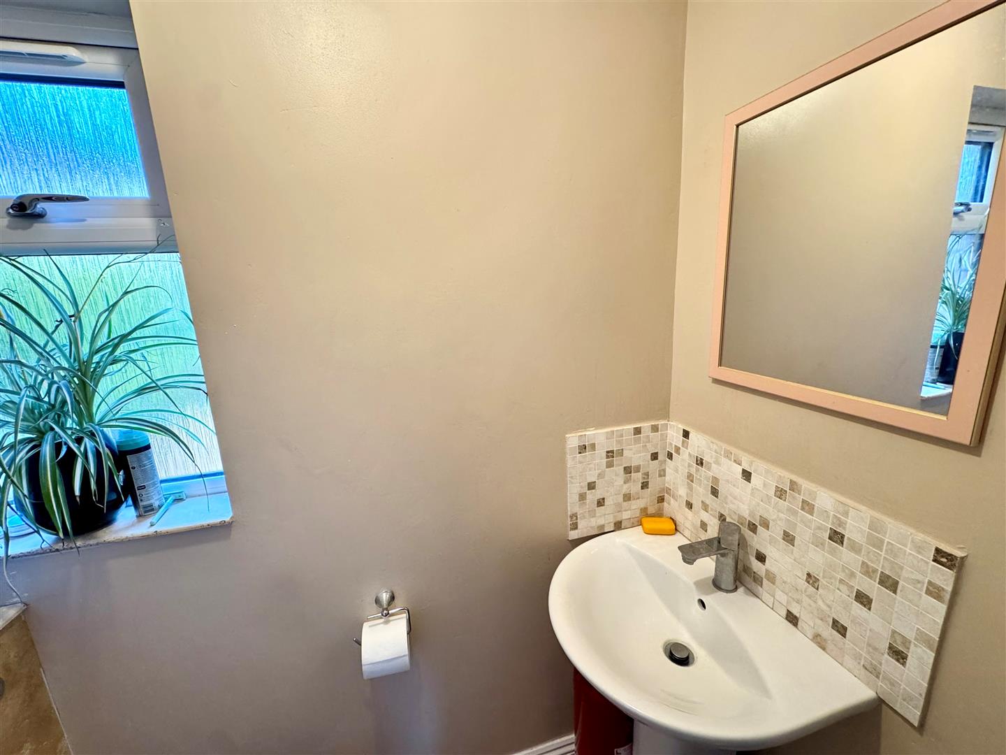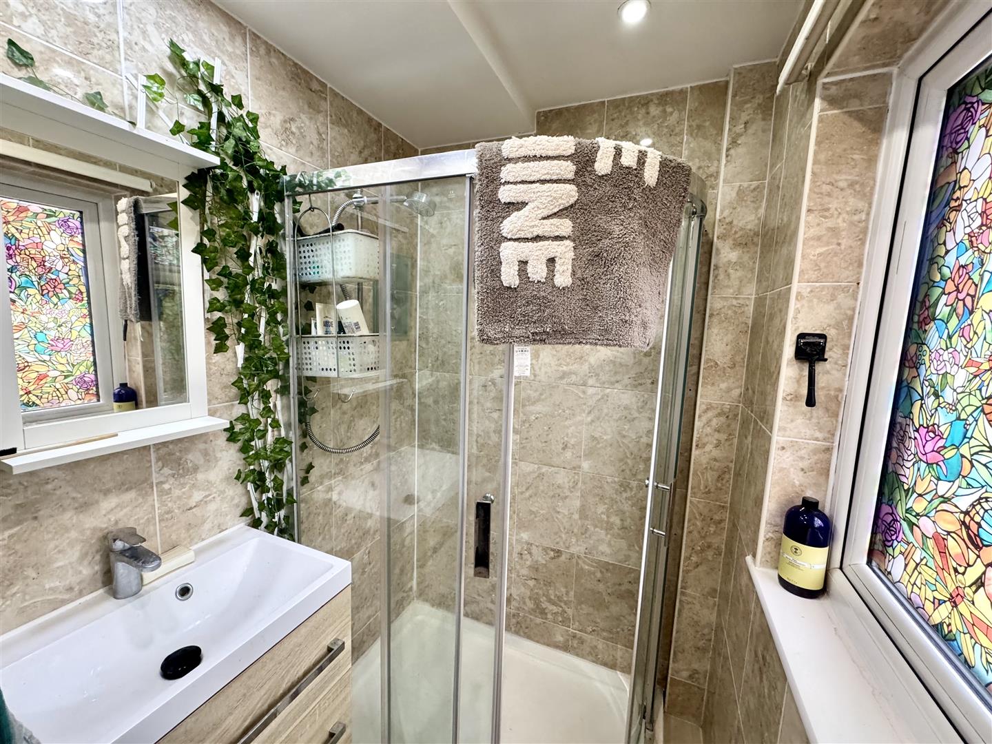 Appointed with a two-piece suite to include wash hand basin set over storage drawers and a corner shower unit with electric shower over. Tiled walls. Feature stained glass window to rear elevation.