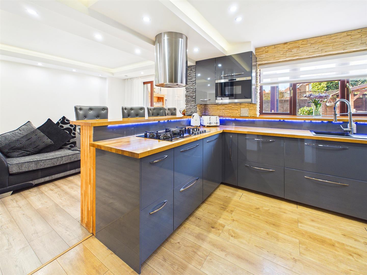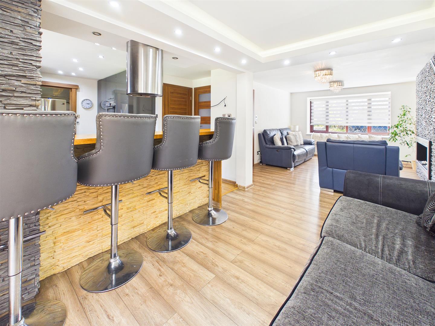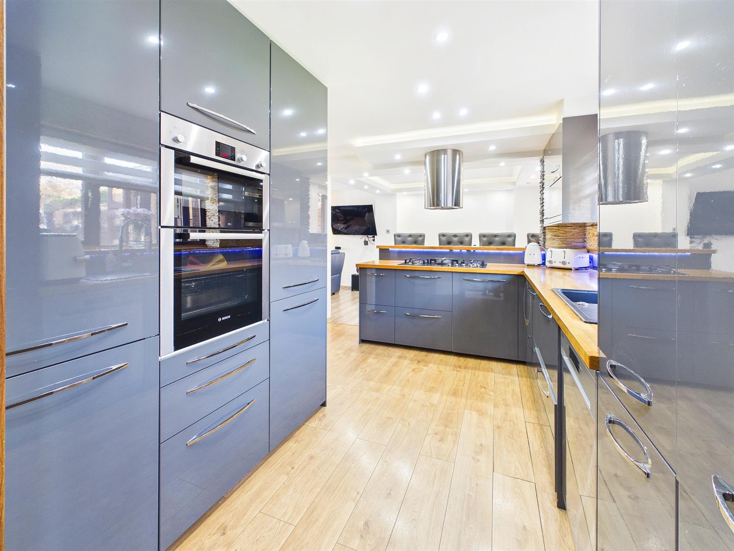 A fantastic open plan entertaining space with the kitchen area comprising high quality an extensive range of fitted wall and base units with solid wood worktops and laminate splashbacks. A range of integrated appliances to include five ring gas hob with feature extractor hood over, electric microwave and separate eye level Bosch double oven/grill. Under counter dishwasher. Feature breakfast bar providing eating and entertaining space. Built-in understairs storage cupboard. Wood effect flooring with underfloor heating. Window to rear elevation and from the dining area patios doors to:-