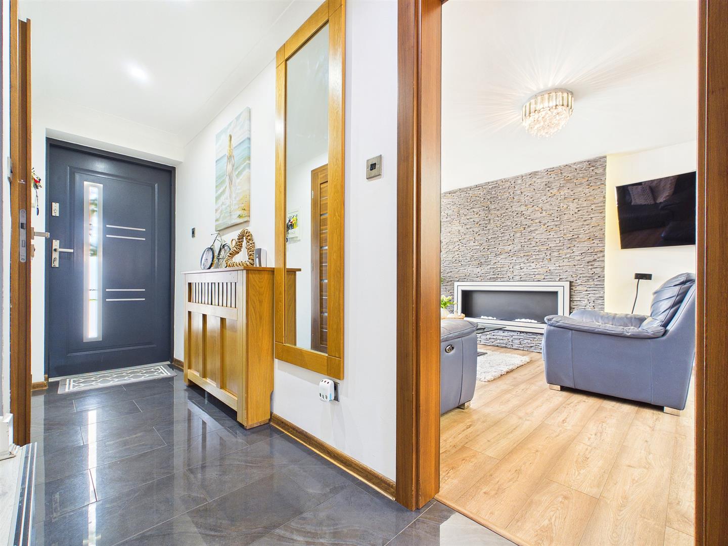 With contemporary tiled flooring and feature half-turn staircase to first floor.