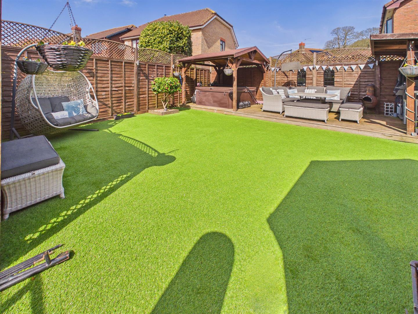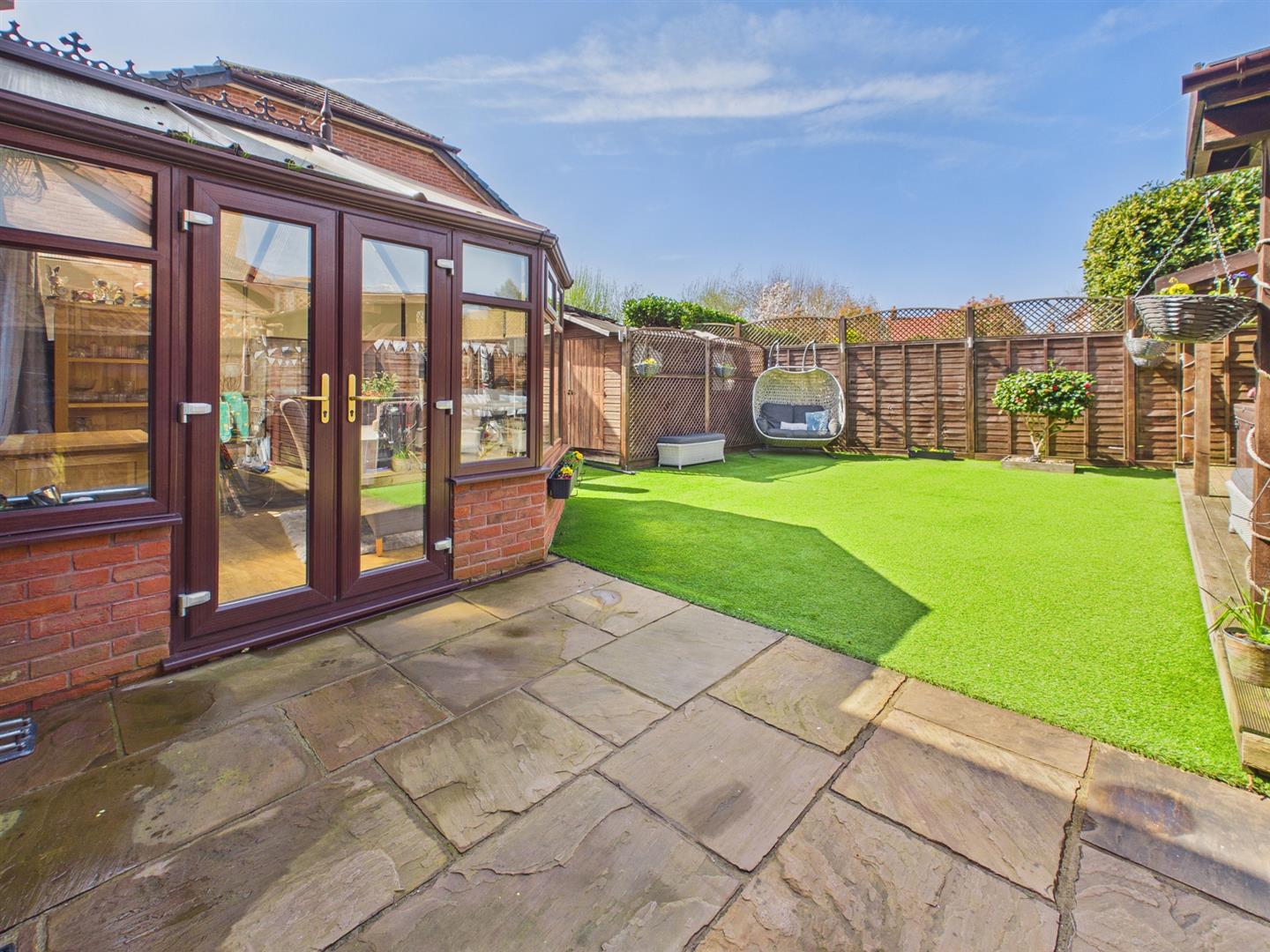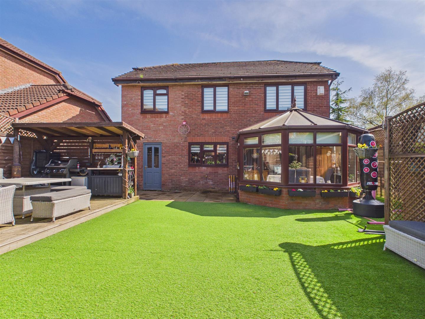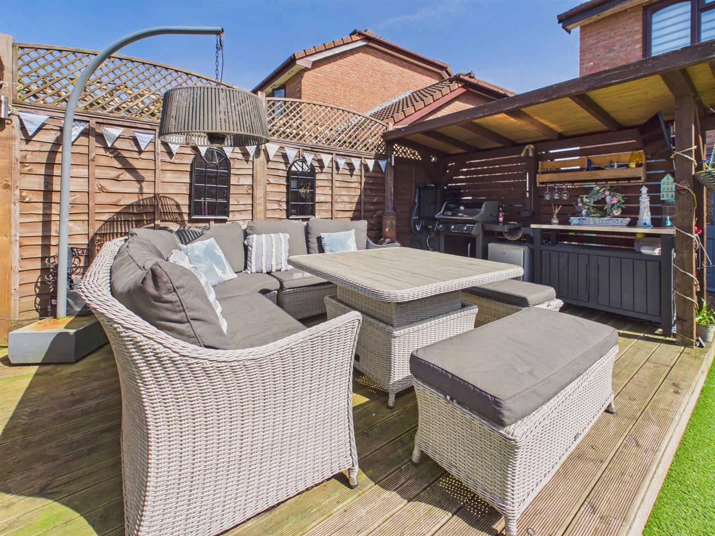 To the front a private driveway laid to tarmac providing parking for two vehicles with a low-maintenance area laid to stones which could provide further off-street parking. A paved pedestrian pathway to one side leads through to the rear garden which is a good sized level plot comprising paved patio area, accessed from both the utility and the conservatory, providing an ideal space for dining and entertaining. The majority of the rear garden is of low maintenance and laid to artificial lawn. Wooden storage shed. One of the fantastic selling points of the property is the raised decked area with covered outdoor kitchen, entertaining space and wooden pergola with hot tub (included with the sale). The rear garden is fully enclosed by timber fencing to all sides and there is a range of feature exterior lighting as well as an outside tap.